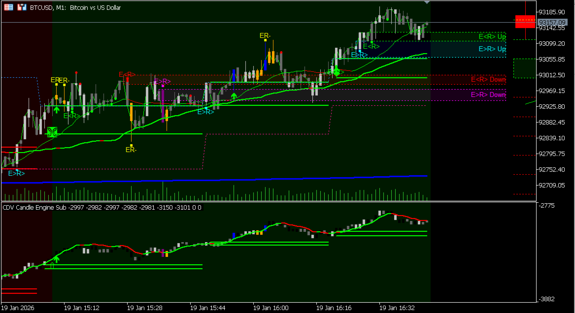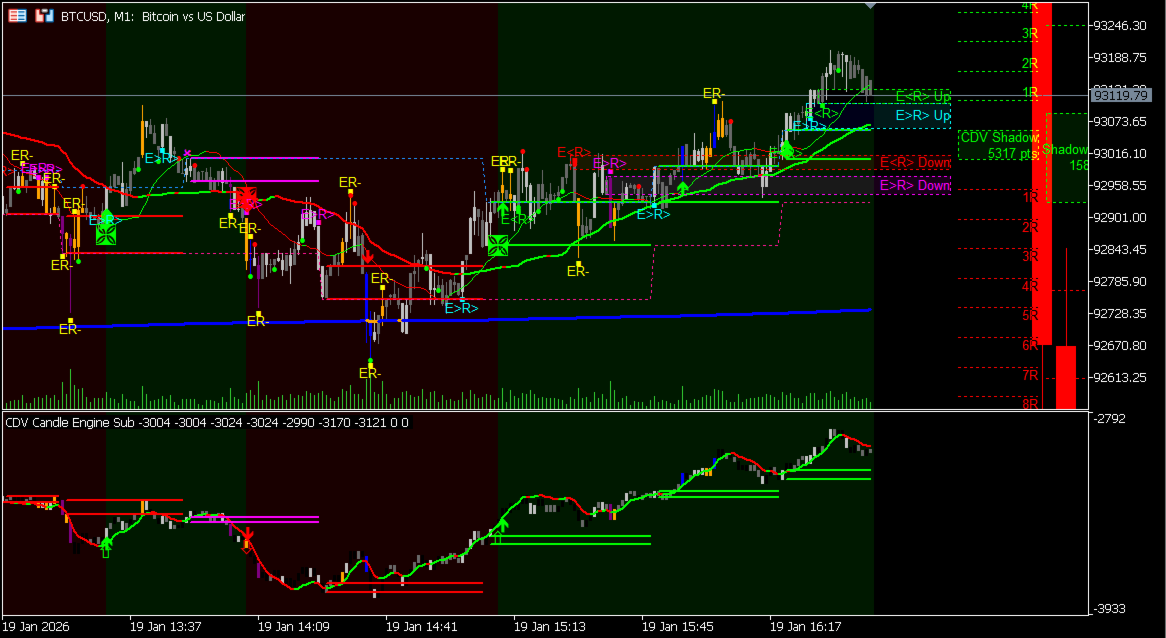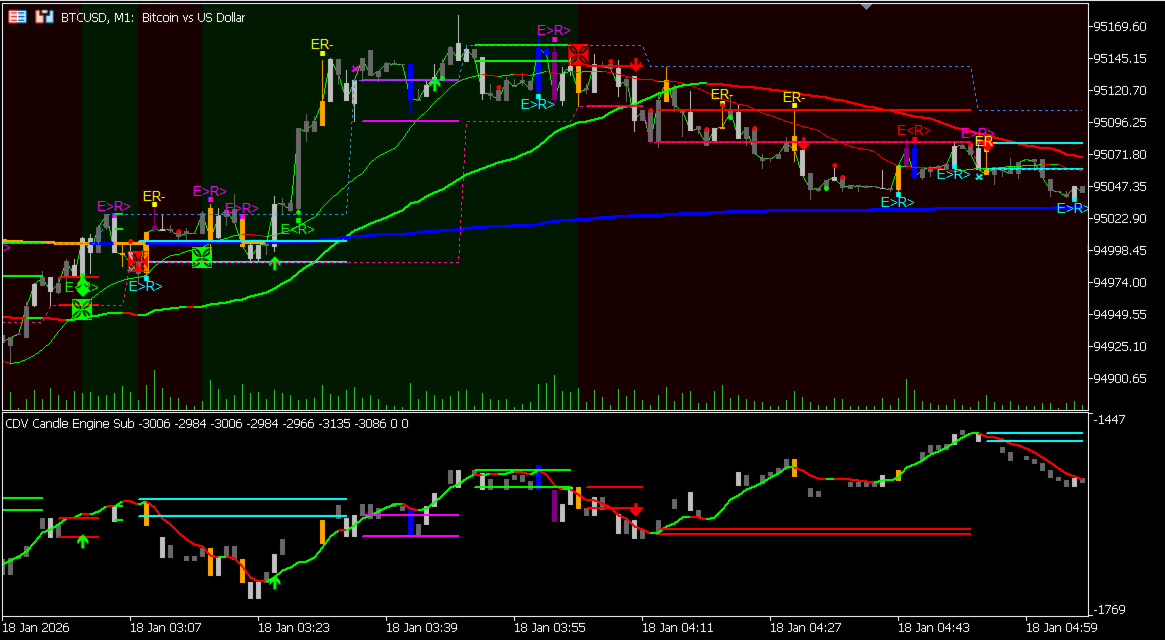 CDV Candle Engine Pro is a MetaTrader 5 indicator designed to visualize Cumulative Delta Volume (CDV) directly on the price chart. It helps traders read market pressure more clearly by showing the balance between buying and selling activity in a clean, customizable layout.