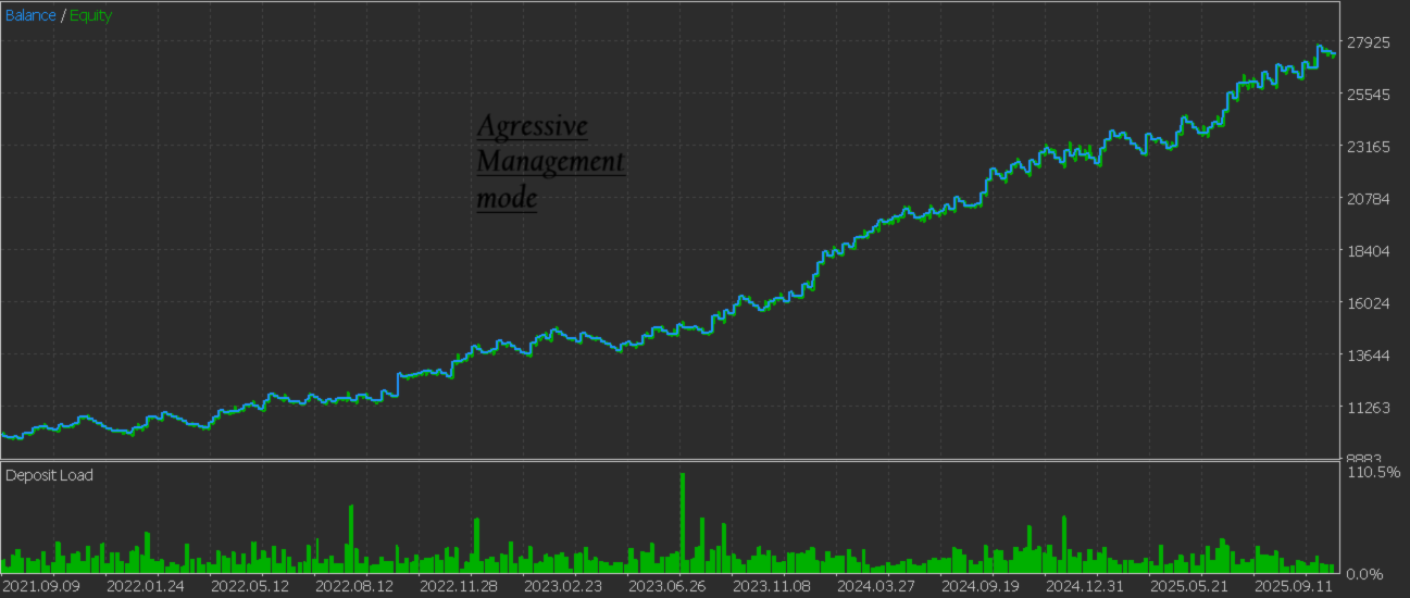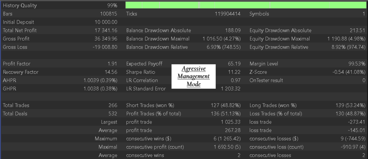 - Trade Management Mode : Aggressive trade management allows you to follow the trade very closely with a trailing stop based on the initial risk. It enables securing profits quite early. This management mode primarily aims for capital preservation, ideal, for example, during a drawdown phase. Whereas the conservative mode uses a trailing stop based on volatility, thus giving the market more room to move while accepting the risk of a reversal. This management style is by far more profitable in the long run.