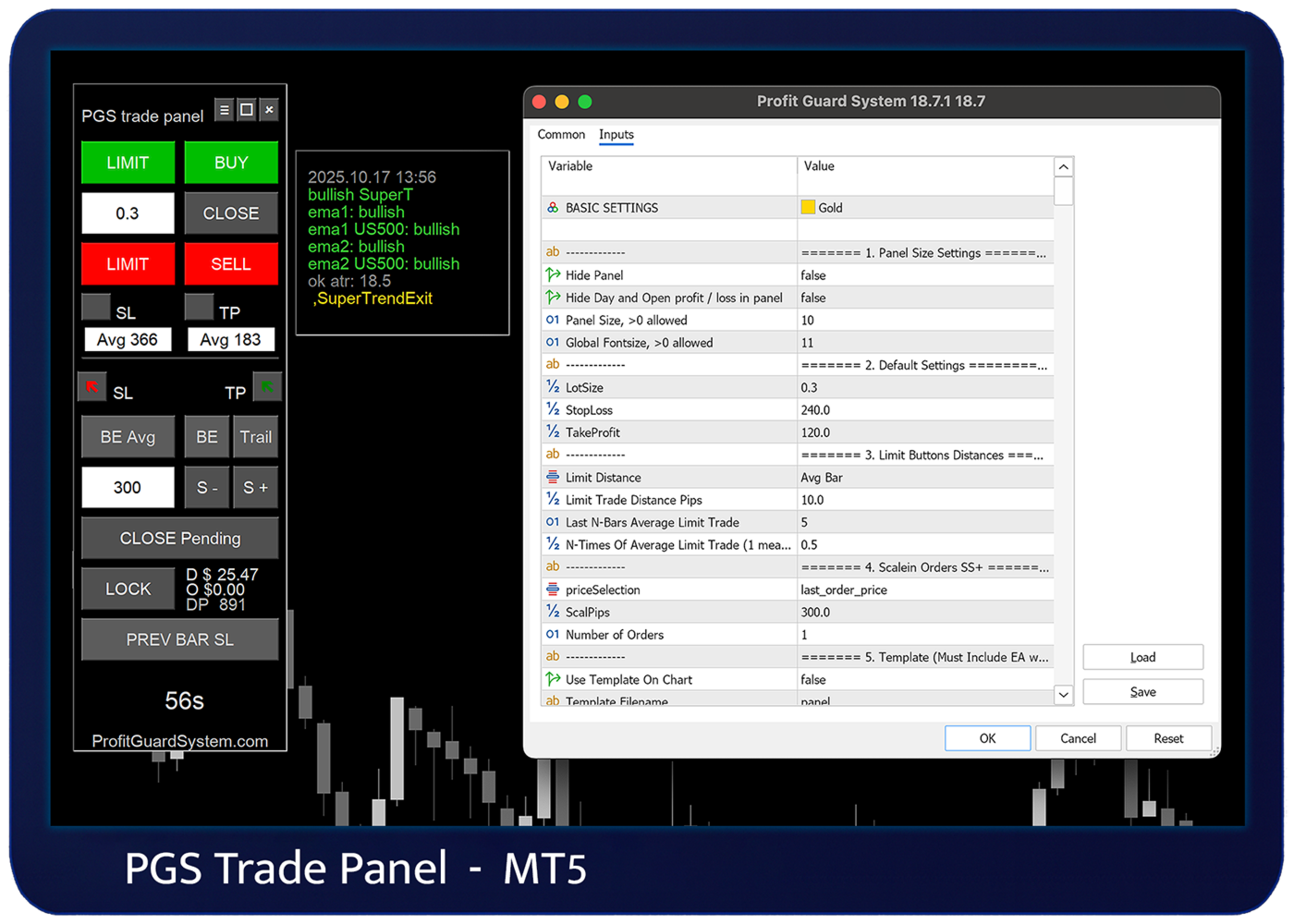 PGSindicator is a free visual companion indicator designed to work together with the Profit Guard System Trade Panel for MetaTrader 5.