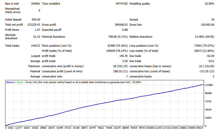 Select a minimum deposit of 500 USD, choose the M5 time frame, set a custom date range, select Every Tick for the model, pick a leverage suitable for you within the available range, and click Start Test to get high-precision backtesting results.