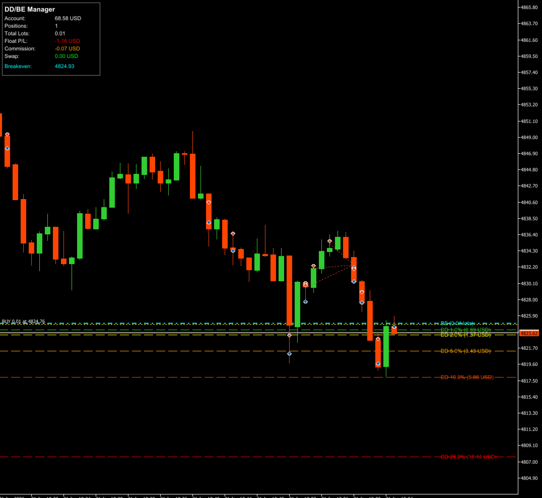 Drawdown Lines: The EA calculates how much the price needs to move against your net position to lose a specific percentage of your account. It draws a line at that price.