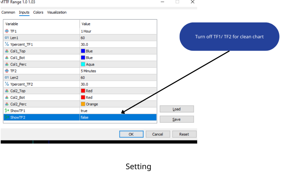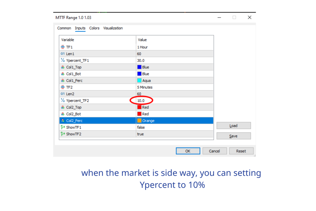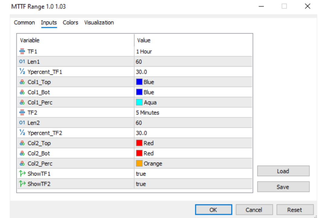 TF1 = PERIOD_H1 Len1 = 60 (60 candles to determine range) Ypercent_TF1 = 30.0% (30% zone from top/bottom) Colors: Blue (Top/Bottom), Aqua (% lines)