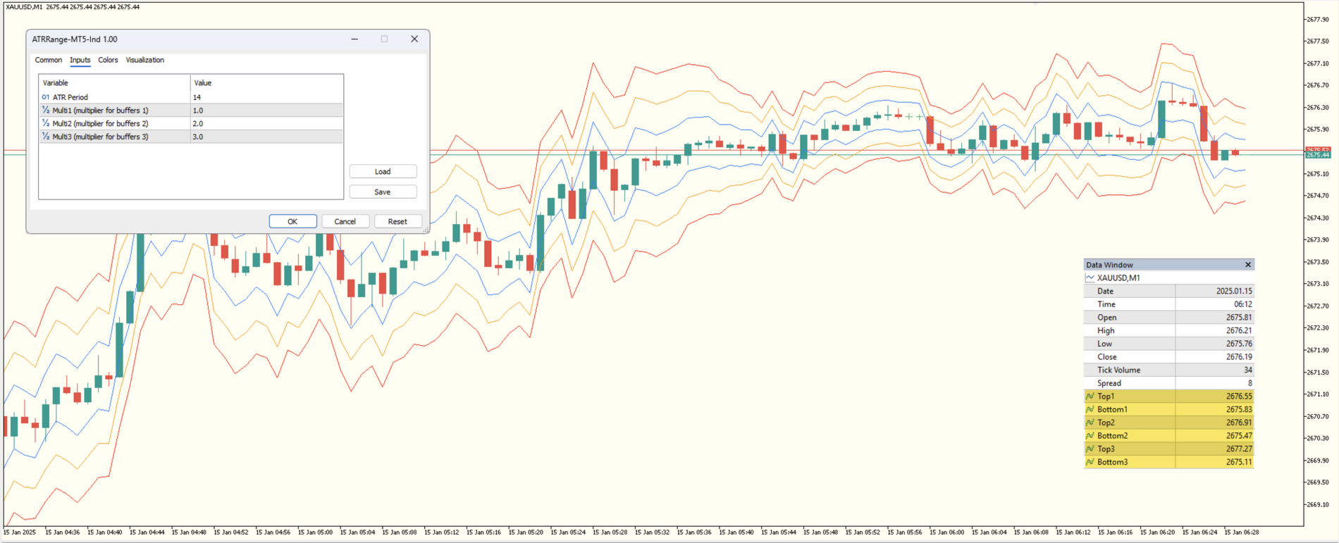 ATRRange-MT5-Ind — an indicator for MetaTrader 5 that builds volatility channels based on ATR with three multiplier levels.