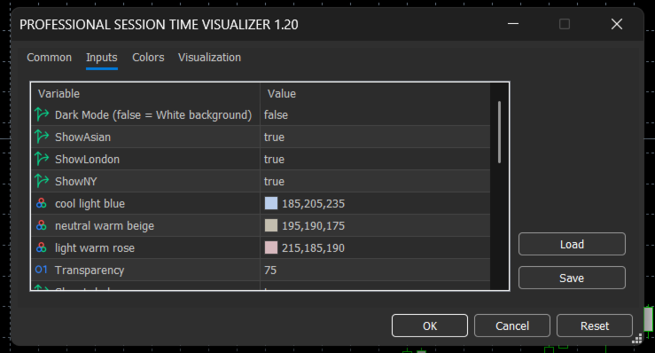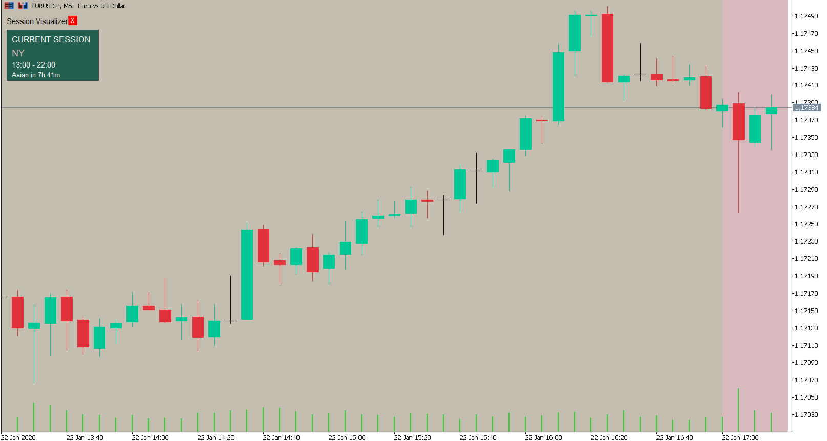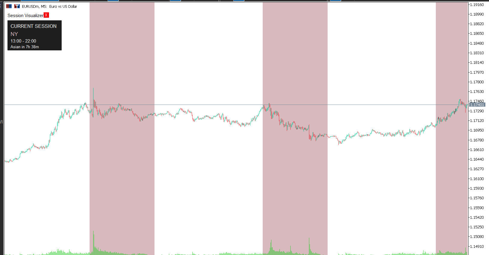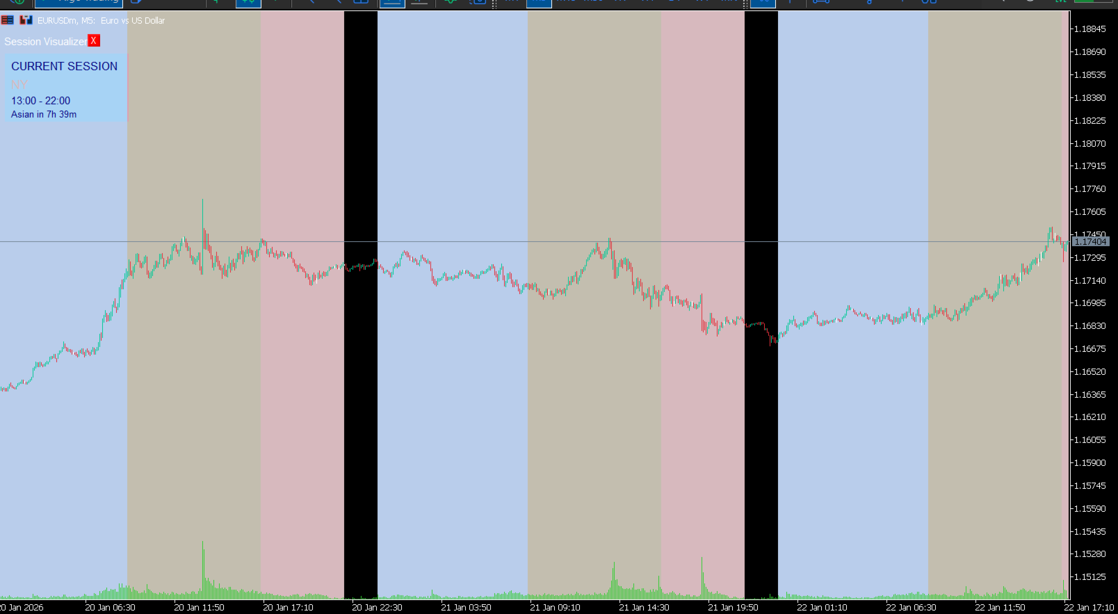 - Color-coded sessions: Asian (Cool Blue), London (Warm Beige), NY (Soft Rose)
