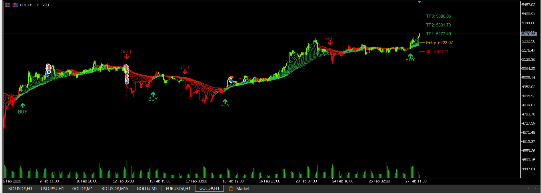 Alpha One è un indicatore professionale che segue i trend e fornisce chiari segnali di ACQUISTO e VENDITA con livelli automatici di ingresso, stop loss e tre livelli di take profit tracciati direttamente sul grafico.
