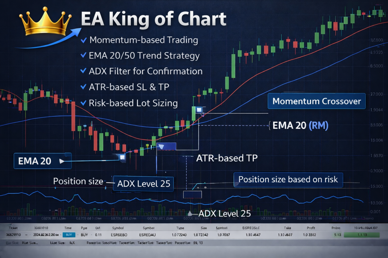 EA King of Chart is an automated trading robot developed for MetaTrader 5 (MT5), designed to trade on the H1 (1-hour) timeframe. The EA independently analyzes market momentum and places trades only when strong price movement conditions are detected.