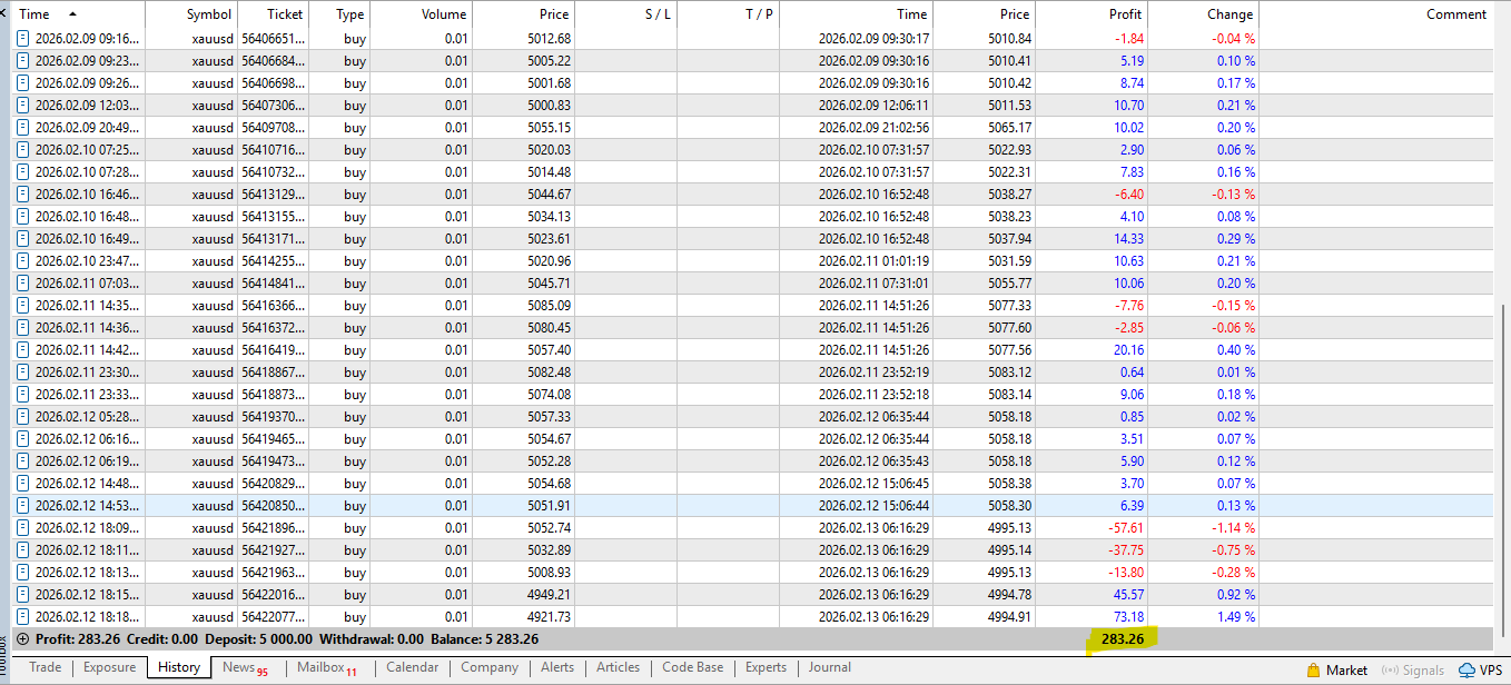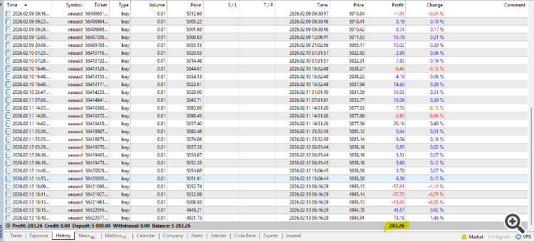 🔍 Recent forward validation (Feb 2026) has shown close alignment between Strategy Tester results and live demo behavior under the same settings and conditions. Of course, as with any trading system, variations can occur due to spreads, execution speed, and market dynamics.