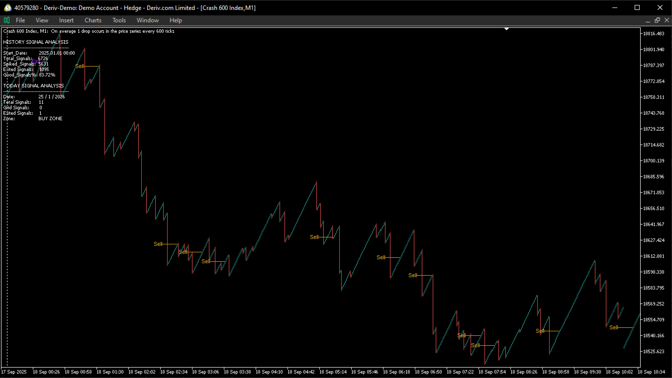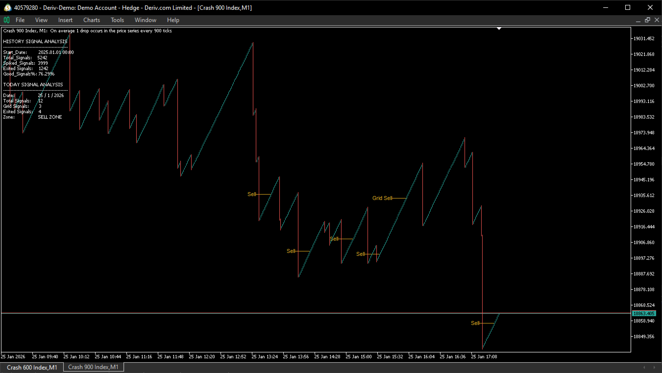 This indicator is specifically designed for all Deriv boom and crash (1000, 900, 600, 500, 300& 150) indices. The indicator targets spikes for boom and crash indices. The indicator uses higher timeframe indicators to filter spikes in lower timeframe chart.