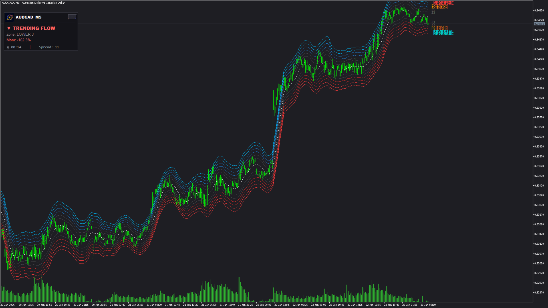 Il sistema utilizza un algoritmo proprietario adattivo che si adatta automaticamente in background a qualsiasi asset, sia che tu stia negoziando oro, criptovalute o valute. Non devi calibrare nulla. Carichi l'indicatore e questo si sincronizza istantaneamente con il ritmo attuale del mercato.