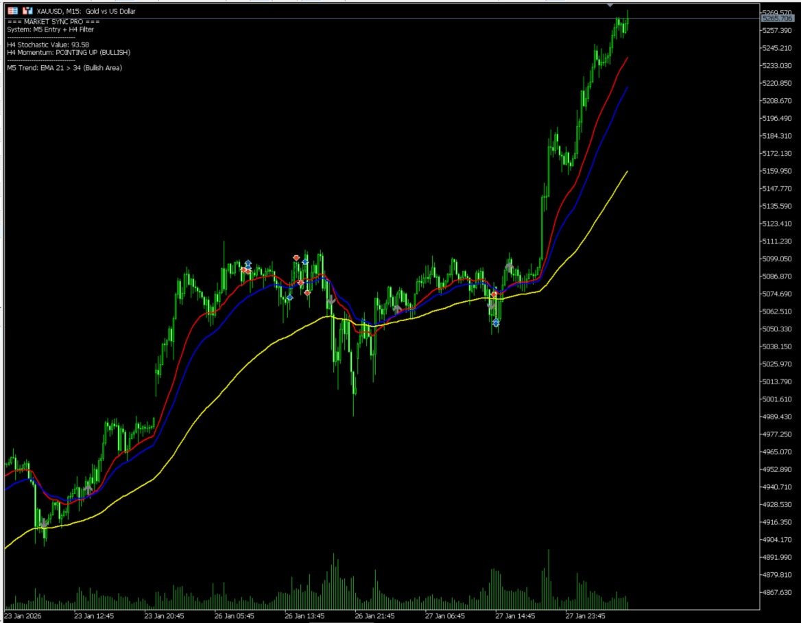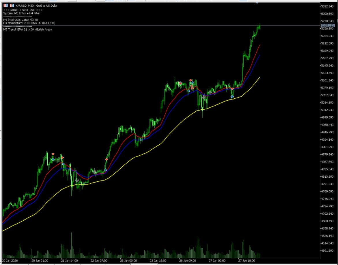 Why Market Sync Pro? Professional traders know that "The Trend is Your Friend." Market Sync Pro ensures you never trade against the major trend again. It effectively forces you to follow the institutional flow of the H4 timeframe while executing with M5 sniper precision.