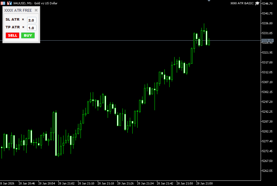 The panel calculates Stop Loss and Take Profit automatically using the current ATR value.