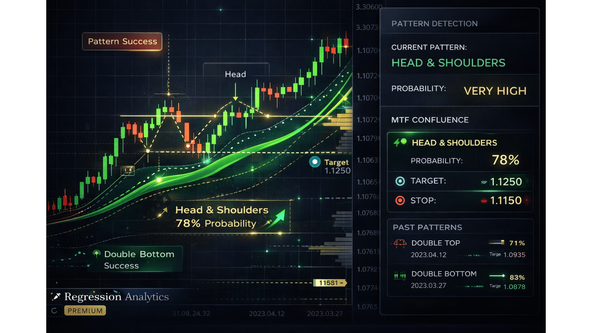 By combining regression direction, deviation analysis, multi-timeframe alignment, and optional pattern recognition, the indicator delivers structured signals with measurable strength and context.