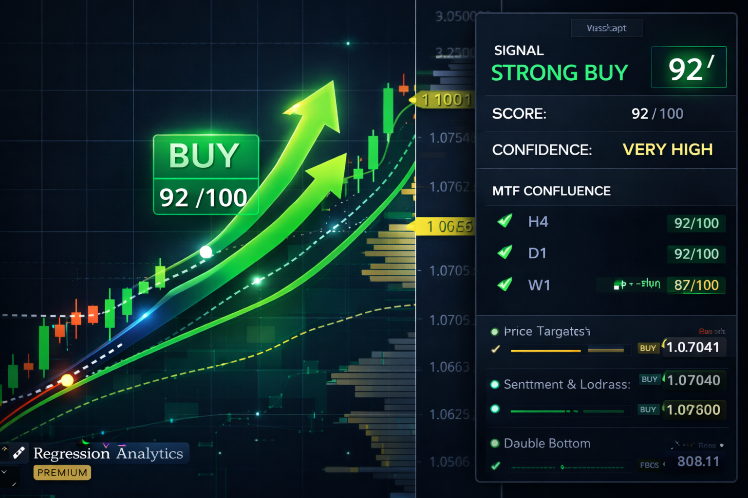 Regression Analytics is a professional-grade MetaTrader 5 indicator designed to analyze price behavior using advanced non-linear regression techniques, multi-timeframe confluence, and signal scoring logic.