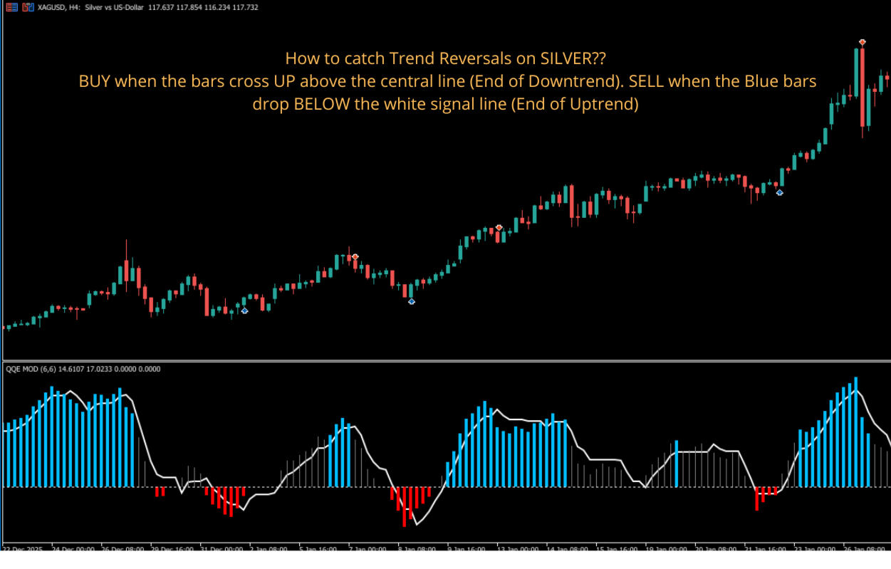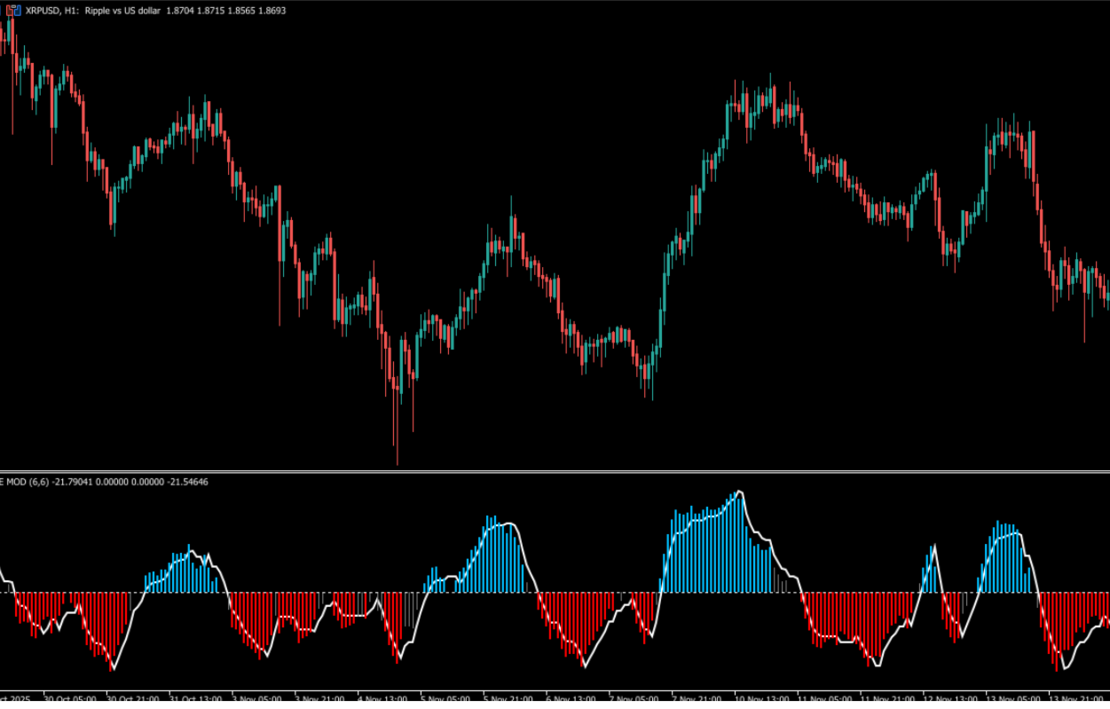 Technical Logic: The algorithm smoothes the RSI values and constructs upper and lower bands. When the smoothed RSI breaks these bands, the histogram indicates a directional change.