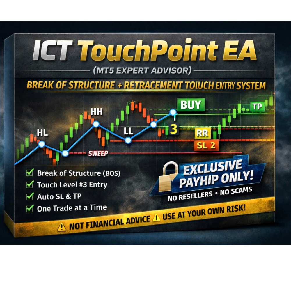 ICT TouchPoint EA is a precision market-structure based MT5 Expert Advisor designed to trade only after a valid Break of Structure (BOS) and enter on a retracement touch—no candle chasing, no impulsive entries.