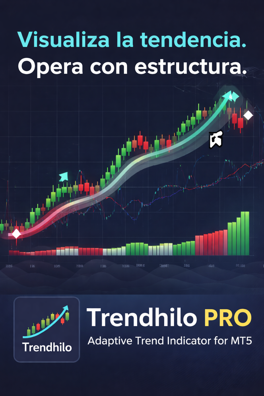 Trendhilo PRO is a professional trend-following indicator for MetaTrader 5, designed to clearly identify the main market direction, trend changes, and continuation opportunities using a visual system based on histogram, arrows, and alerts.