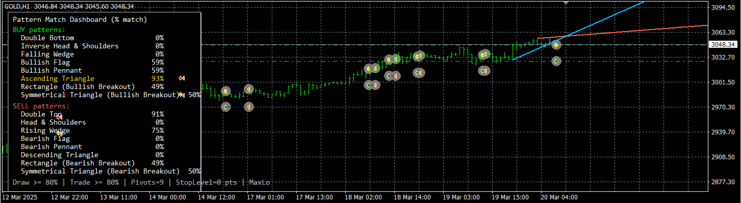 When the pattern score reaches the selected TradeScore (for example 100%), the EA can automatically open one initial market trade in the detected direction.