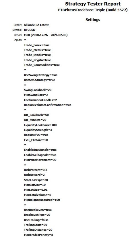 Alliance EA is a professional MetaTrader 5 Expert Advisor built around Swing Trading and Smart Money Concept (SMC) strategies. It is designed for traders who want a structured, rule-based, and disciplined automated trading system rather than risky scalping or martingale approaches.