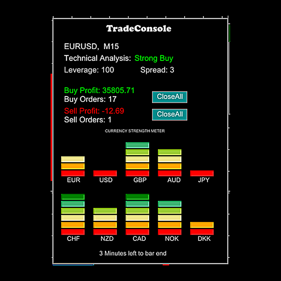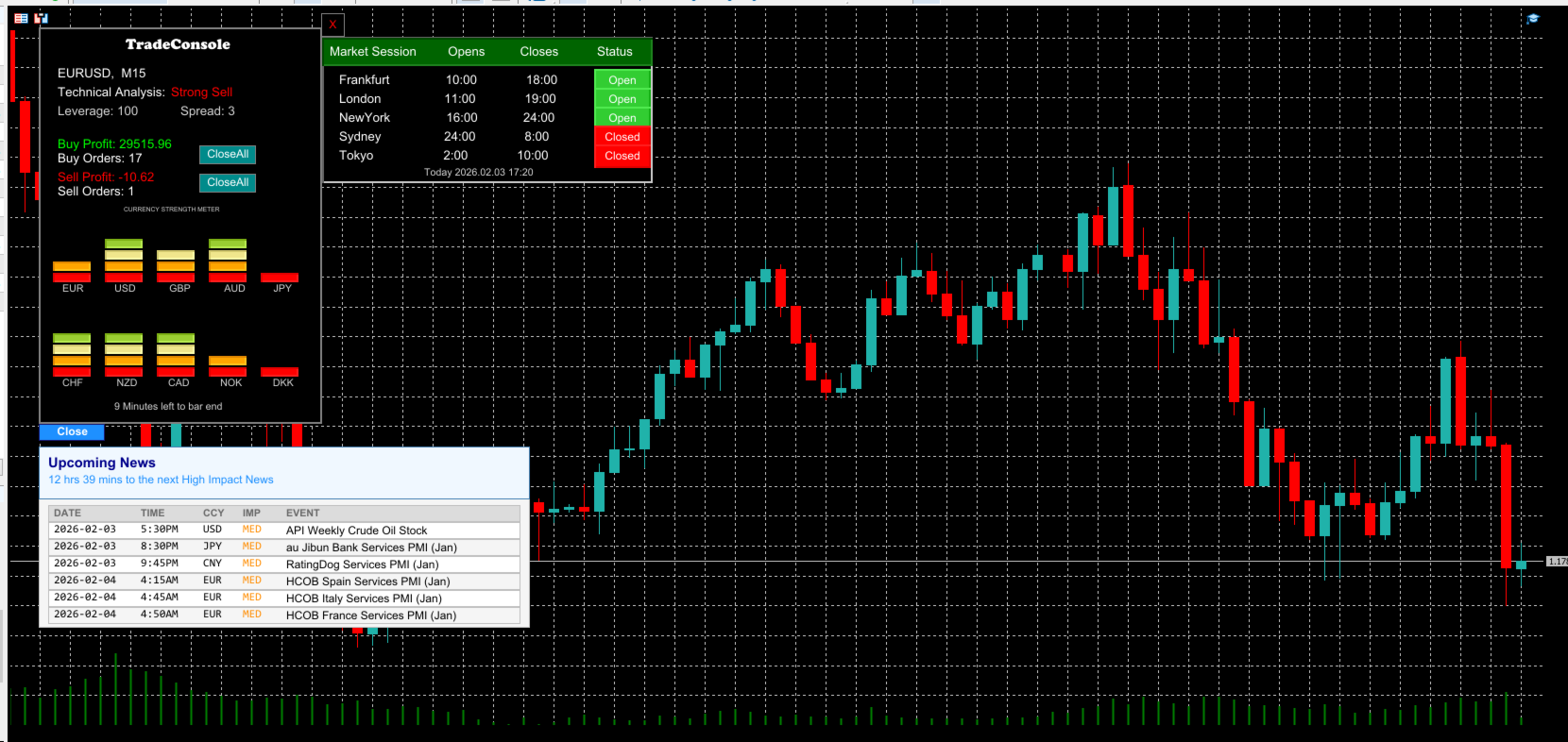 TradeConsole is a lightweight yet powerful on-chart utility that puts the most important market context in one place—so you can trade faster, stay organized, and avoid surprises. It combines market session tracking, an upcoming economic news panel, a visual currency strength meter, a quick technical bias read, plus trade summary and one-click controls. To top it off, TradeConsole includes alerts so you don’t miss key news or timing events even when you’re not watching the chart.