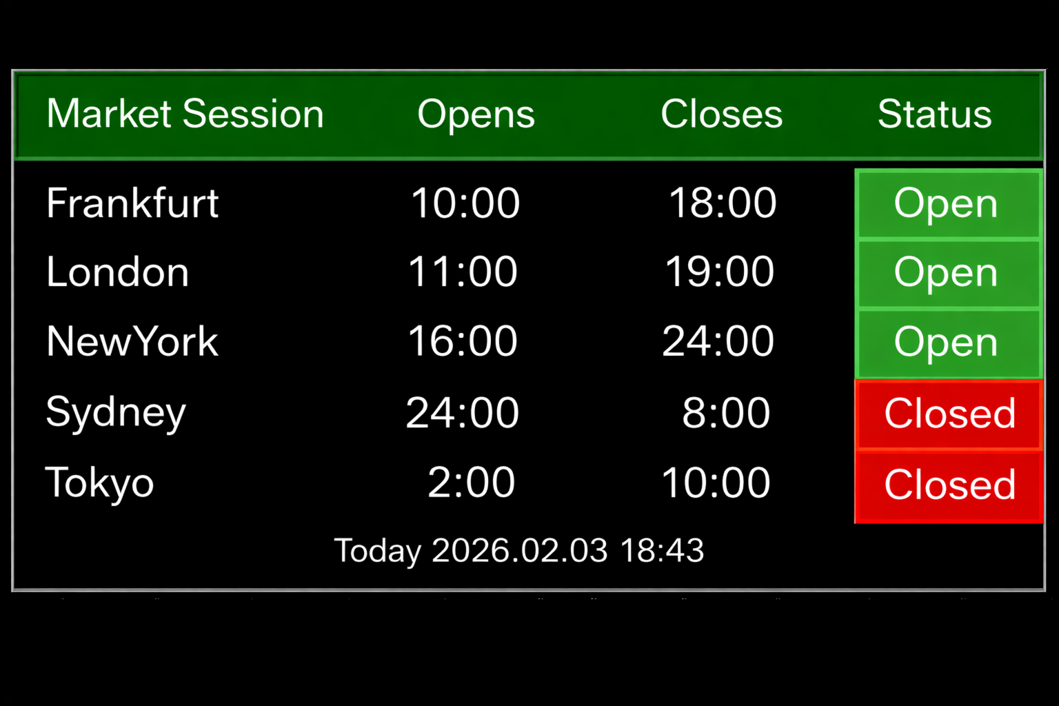 Track major trading sessions: