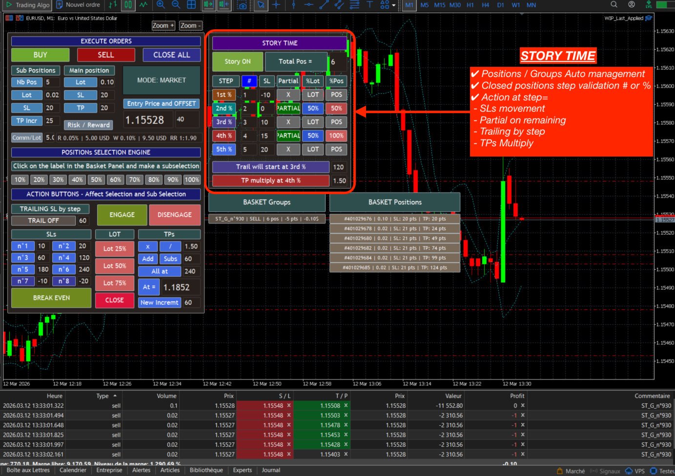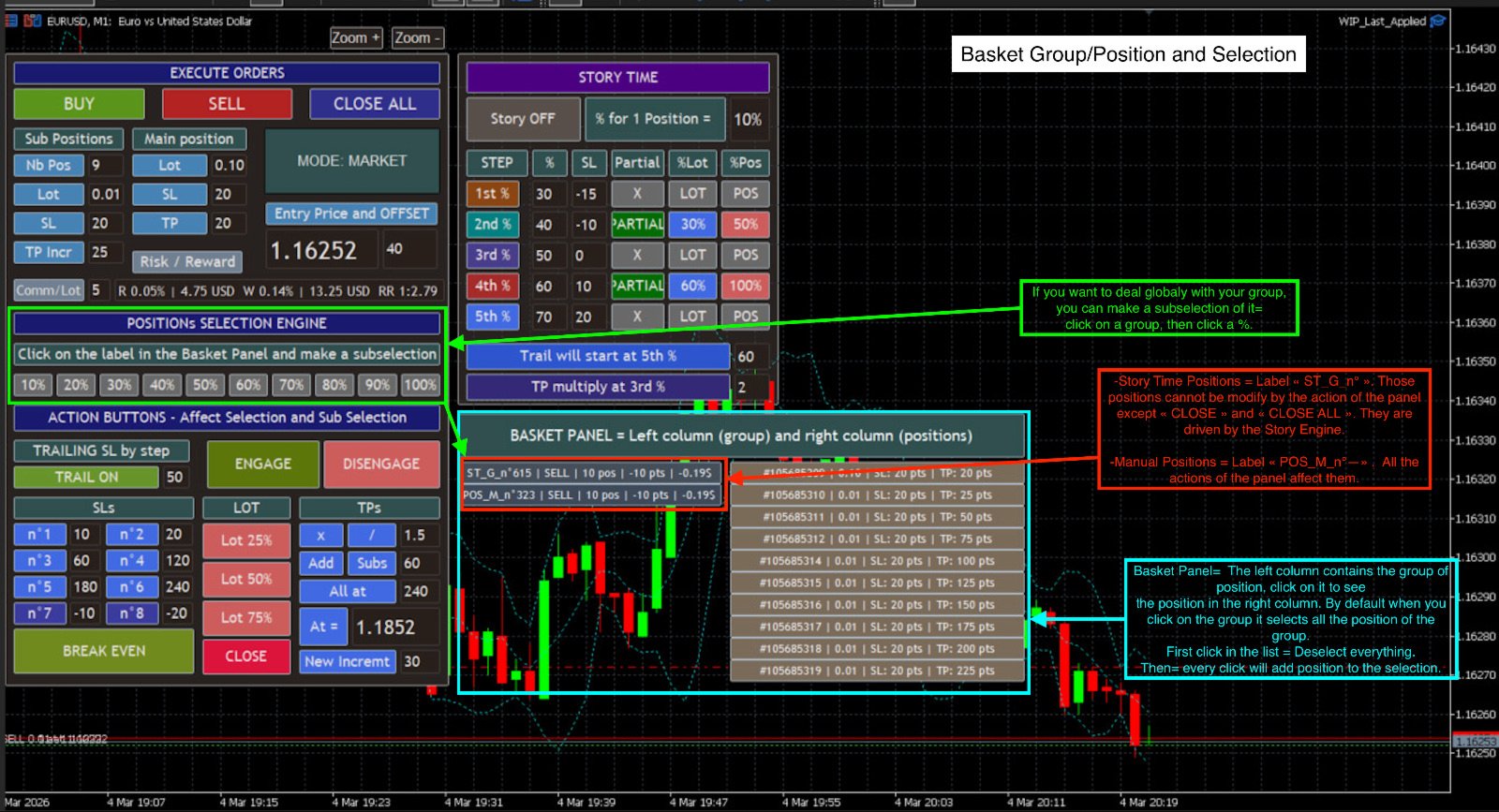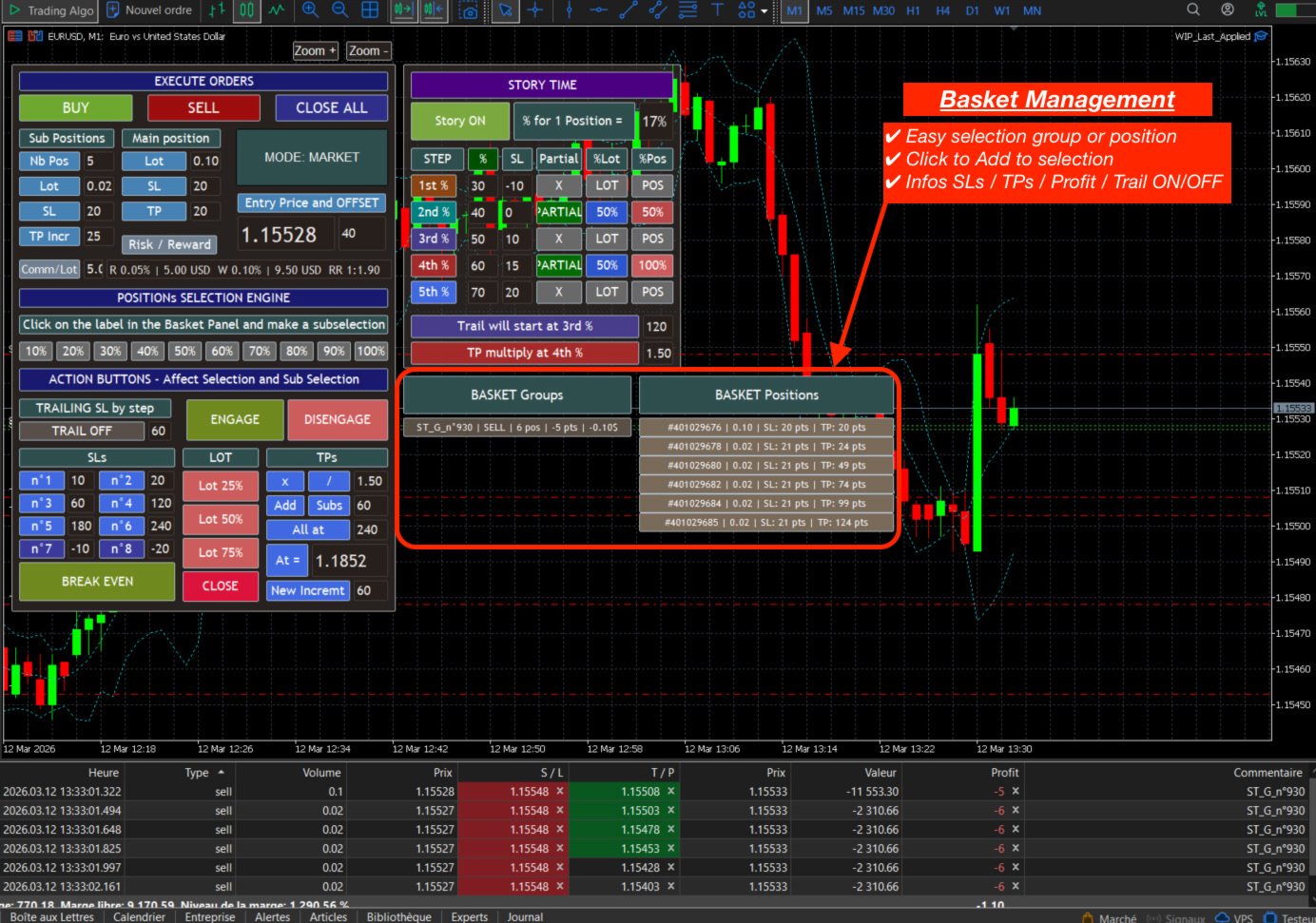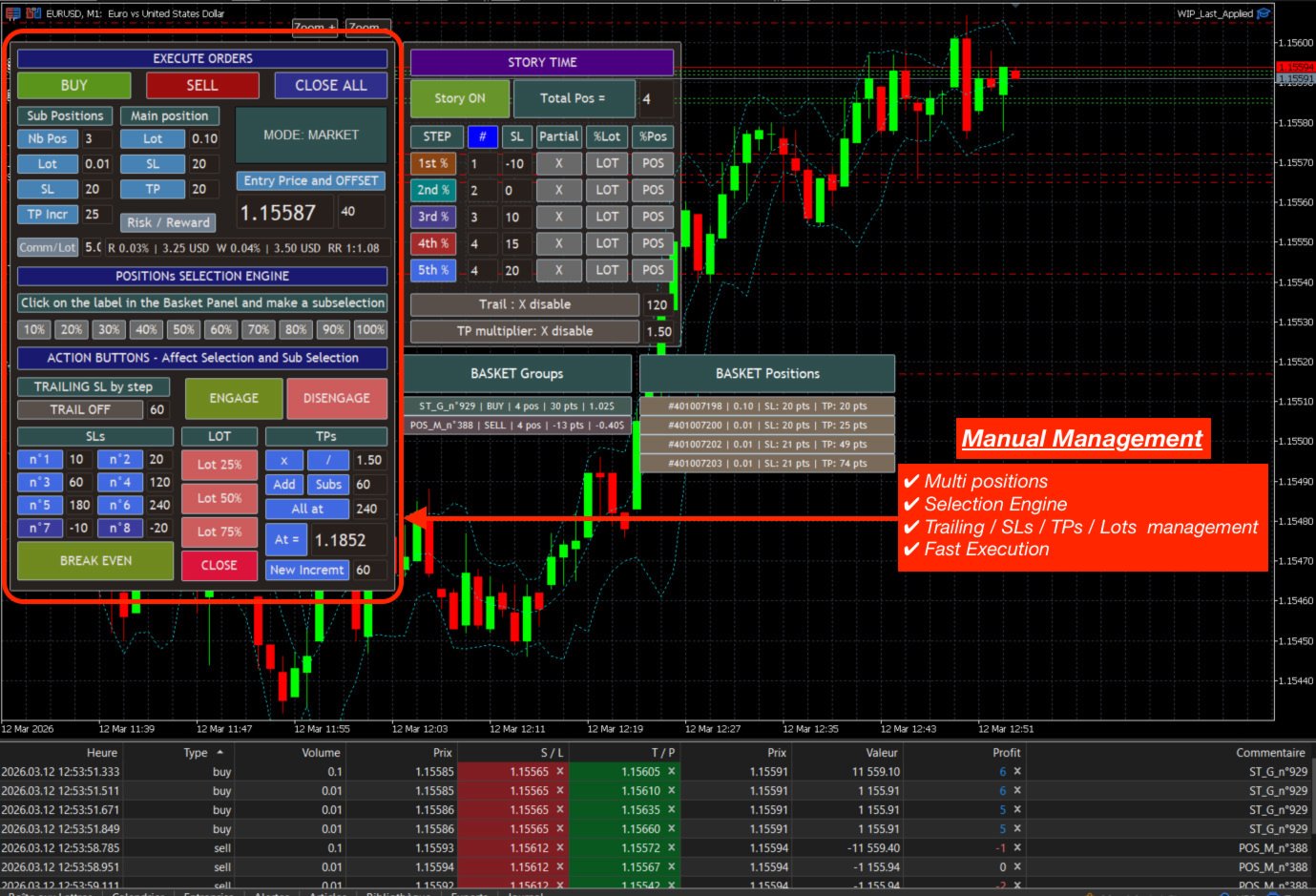 L’EA agisce come assistente per la gestione delle posizioni, permettendo al trader di mantenere il controllo sugli ingressi mentre alcune fasi della gestione del trade vengono automatizzate.