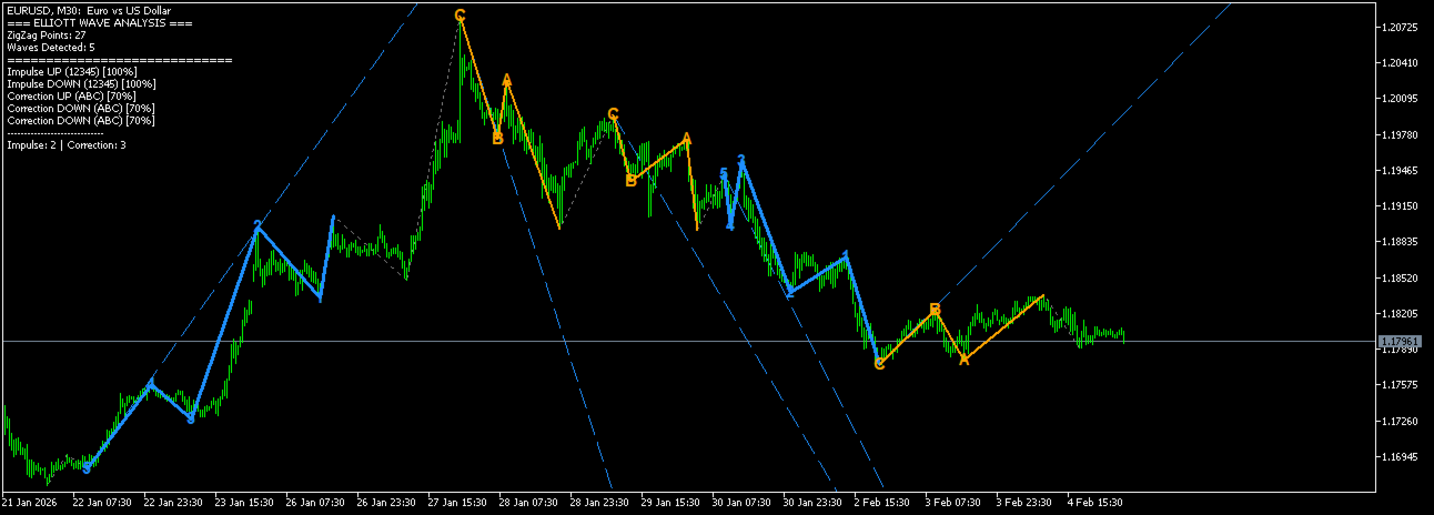 The indicator analyzes price movement using a dynamic ZigZag algorithm, clearly labeling Impulse waves (1–5) and Corrective waves (A–B–C) in a clean and visual way.