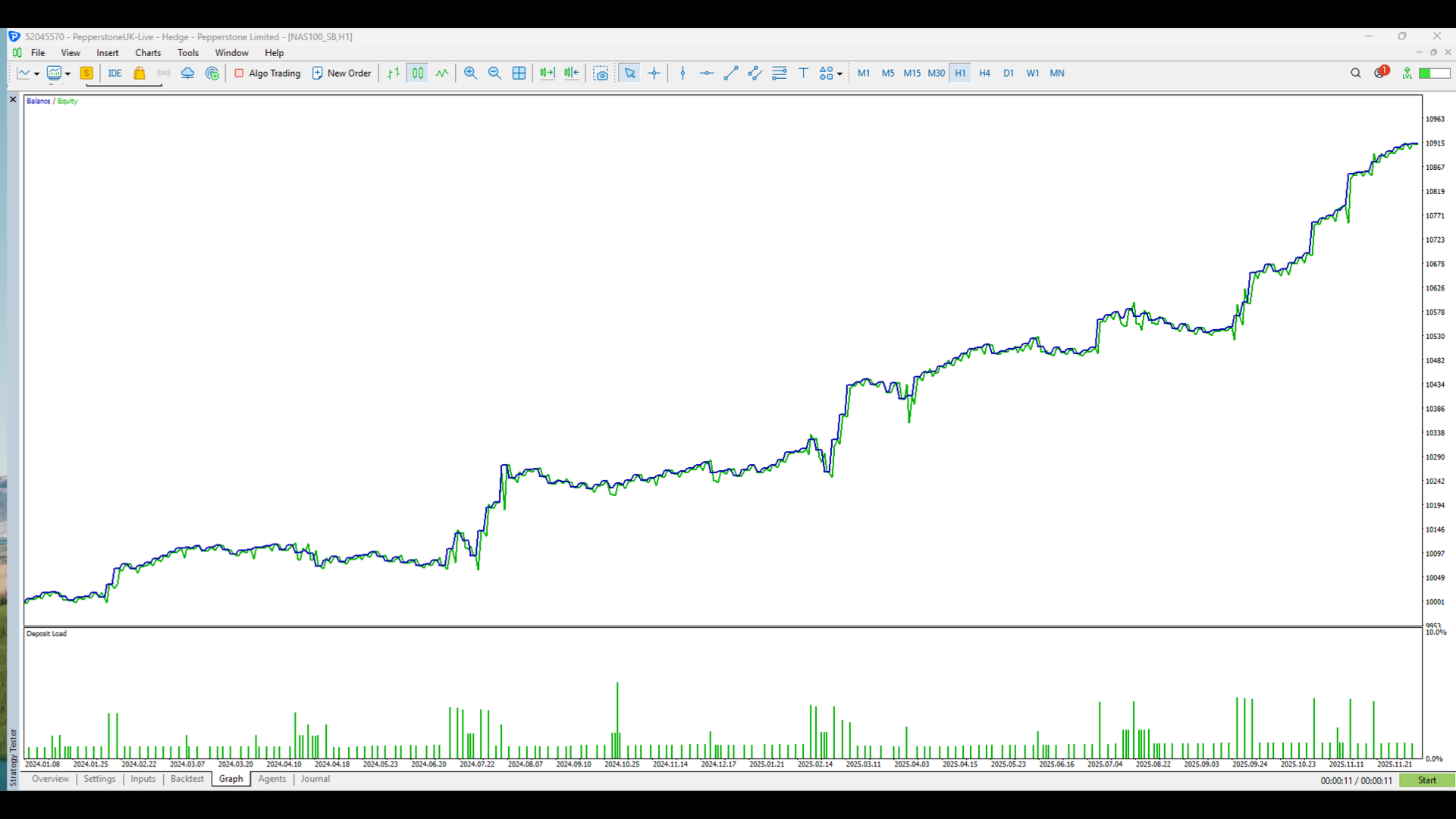 The EA runs on the chart timeframe (H1 is the recommended and tested timeframe) and is intended for systematic testing per instrument / timeframe preset.