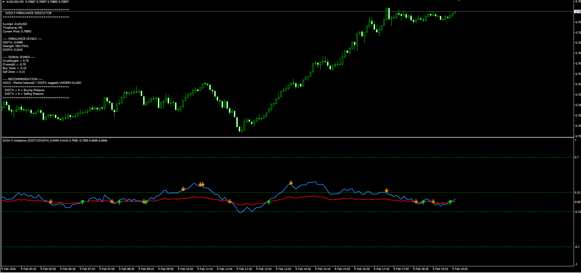 The DISH X Imbalance indicator is a sophisticated volume-based technical analysis tool for MetaTrader 4 that analyzes market order flow imbalance to identify potential trend reversals and fair value deviations. The indicator calculates two core values: DIDTA (Daily Imbalance Delta) and DIDFA (Daily Imbalance Delta Fair Value), providing traders with insights into buying/selling pressure and market valuation.