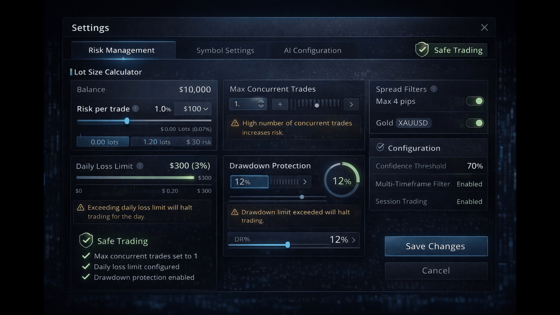 Risk control is a central component of Precision Edge EA. All trades are protected by hard Stop Loss levels and configurable Take Profit targets.