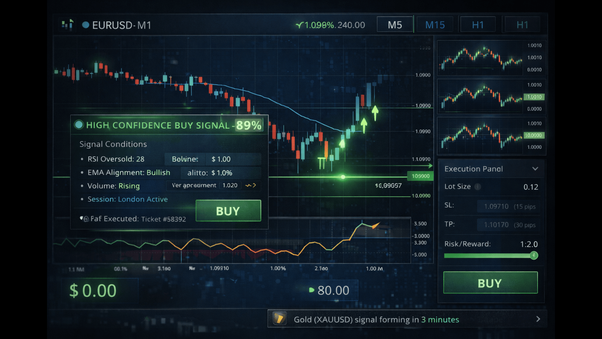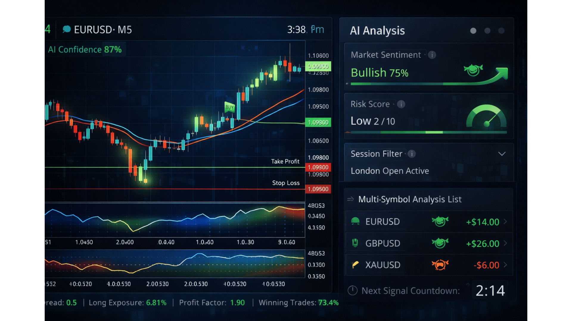 Trades are placed with predefined Stop Loss and Take Profit levels