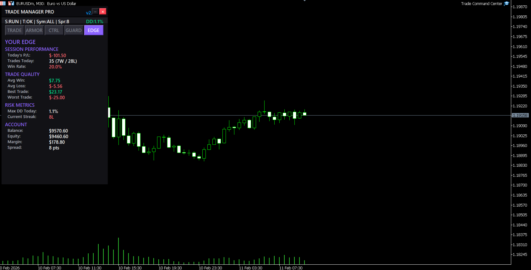The EDGE tab tracks closed trades for the current session: today's P/L, trade count with win/loss breakdown, win rate, average win and loss size, largest win and loss, max intraday drawdown, and current streak. Account balance, equity, margin, and spread are displayed in real time.