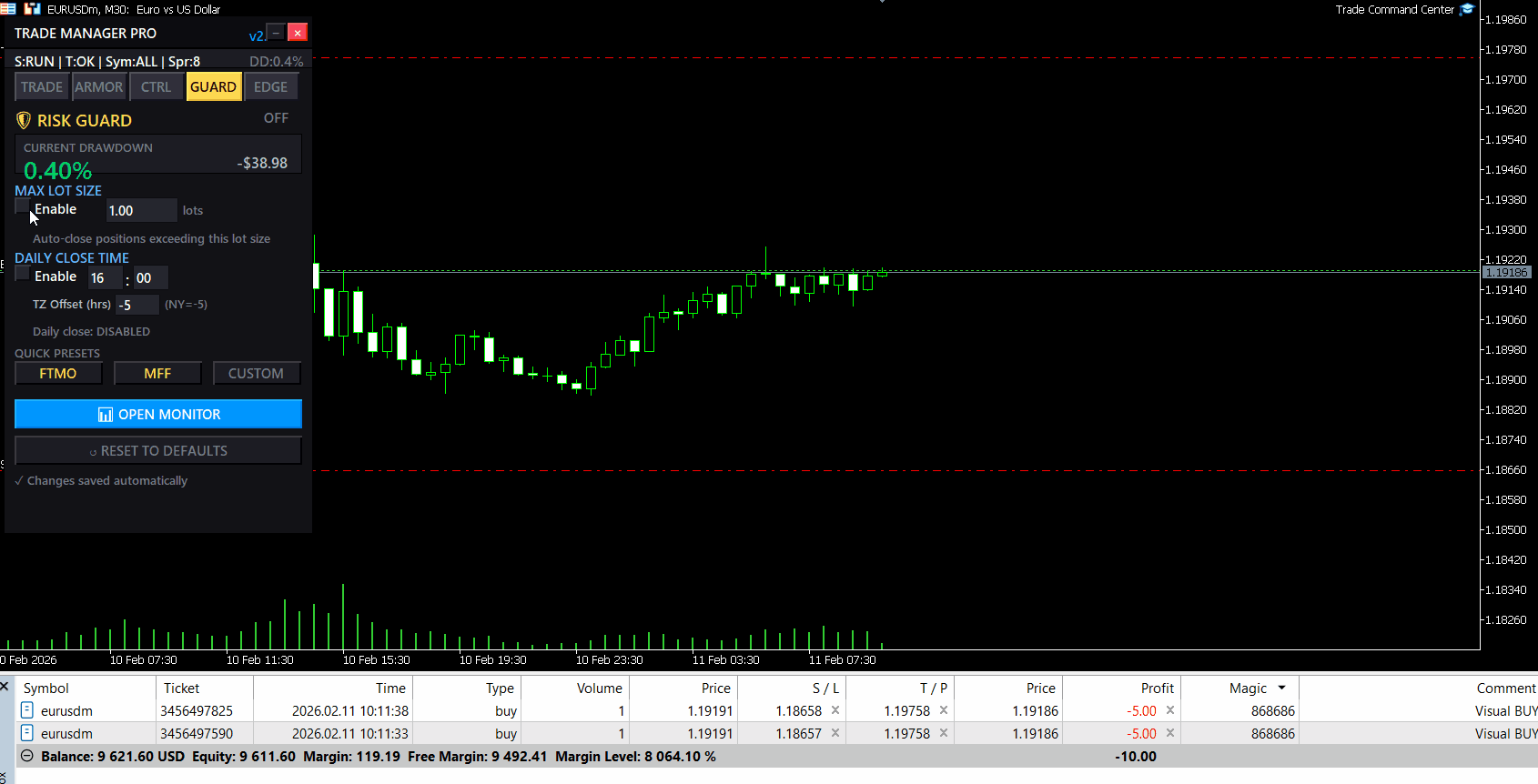 - Max Lot Size: Auto-closes any position exceeding the specified lot size