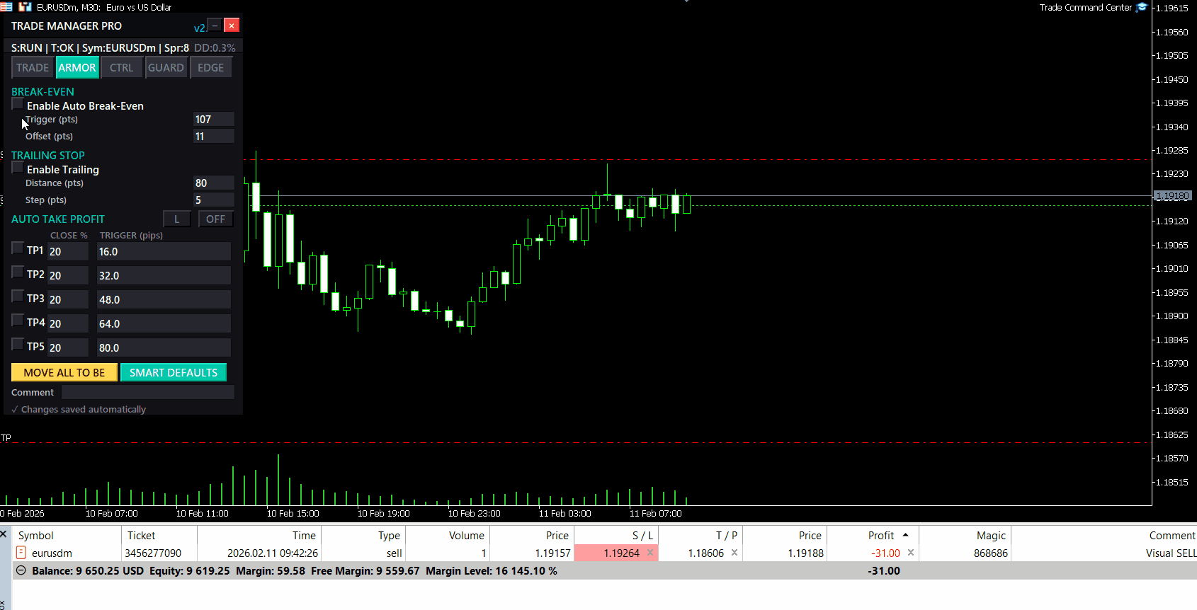 When profit reaches the trigger distance, SL moves to entry price plus an optional offset. Global settings apply to all managed positions. Individual trades can override these values through the visual BE panel, which stores custom trigger and offset in the order comment.