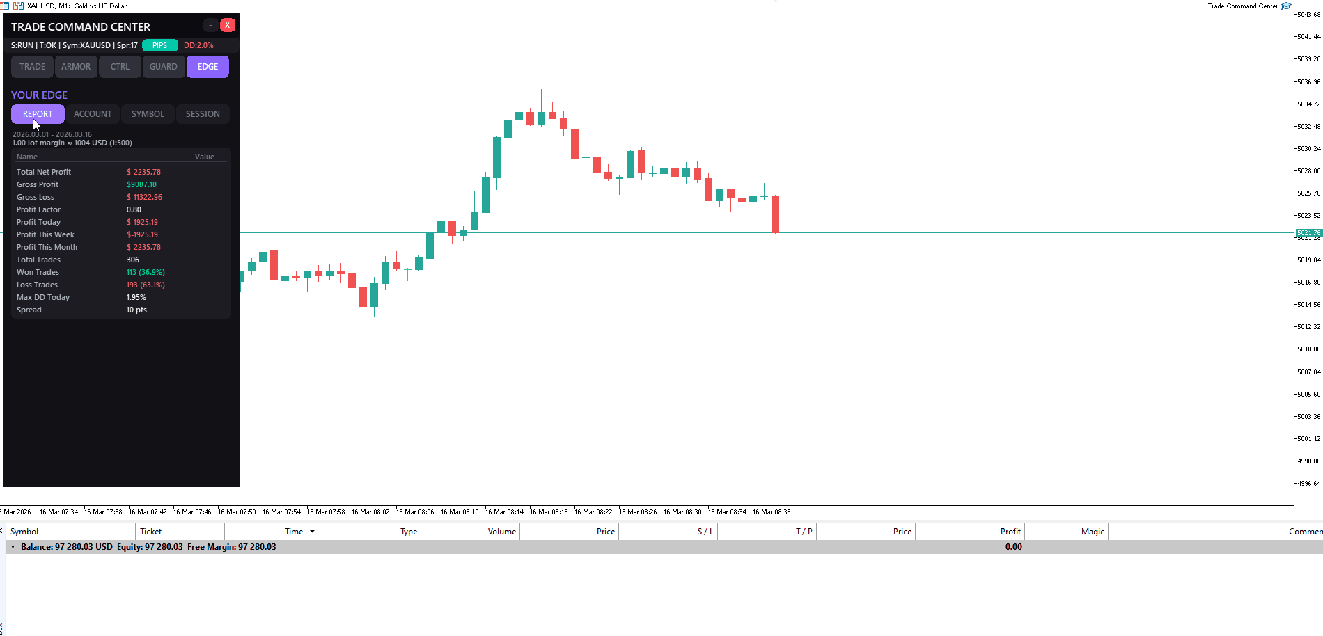 - Report Performance: Profit factor, win rate, profitto/perdita lordo, P/L oggi/settimana/mese, drawdown intraday massimo. Tutti i valori includono swap e commissione.