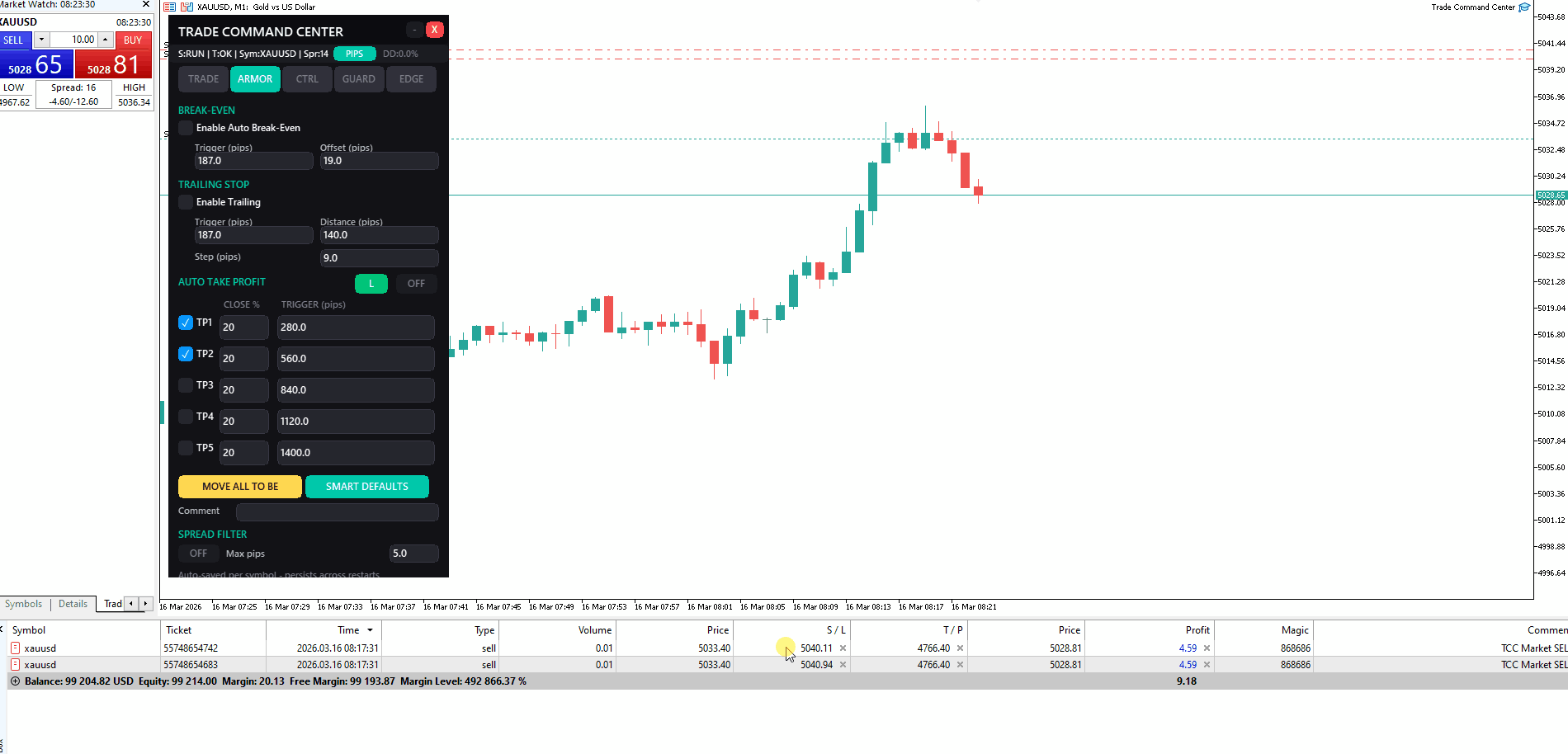 ARMOR — Break-even, trailing stop, TP multi-livello