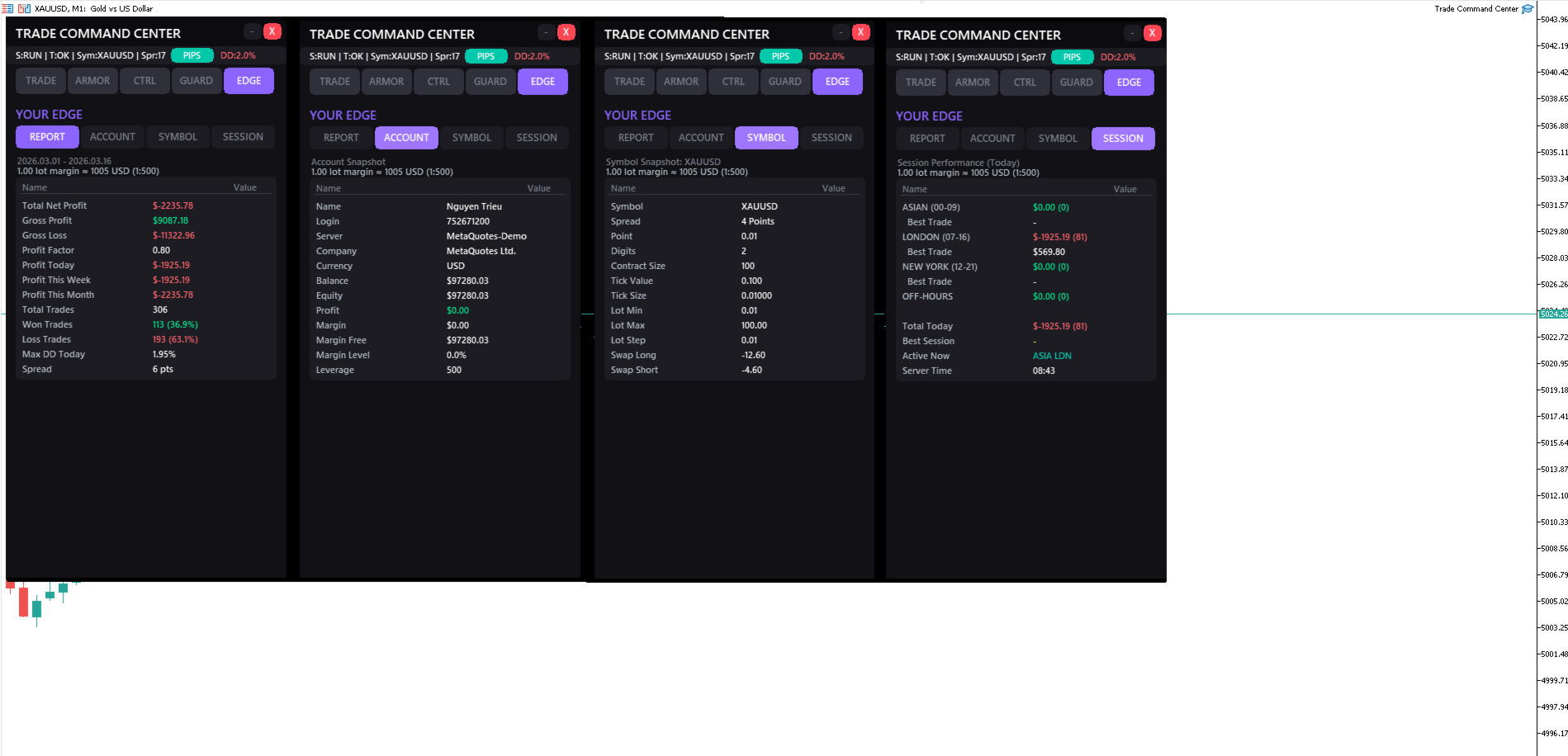 - Dashboard Rischio 6 Metriche: Monitora perdite orarie, giornaliere, settimanali, mensili, drawdown equity e perdita flottante simultaneamente. Non solo una metrica.