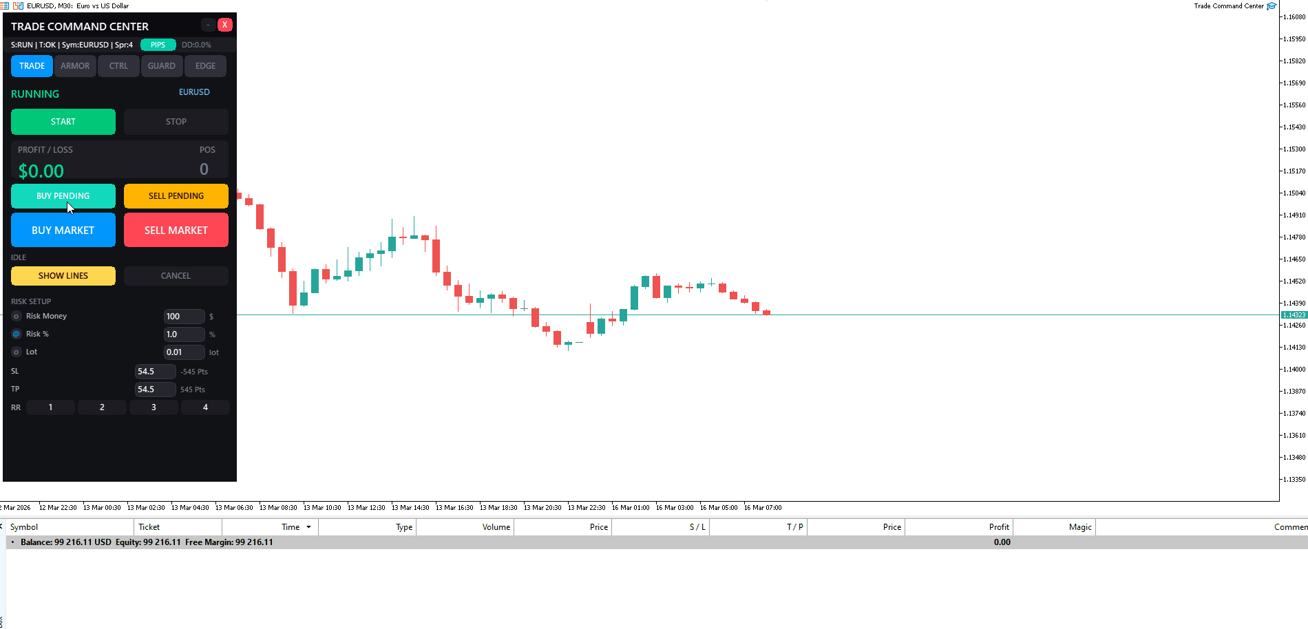 Trade Command Center e un pannello visuale di esecuzione trade e gestione del rischio.