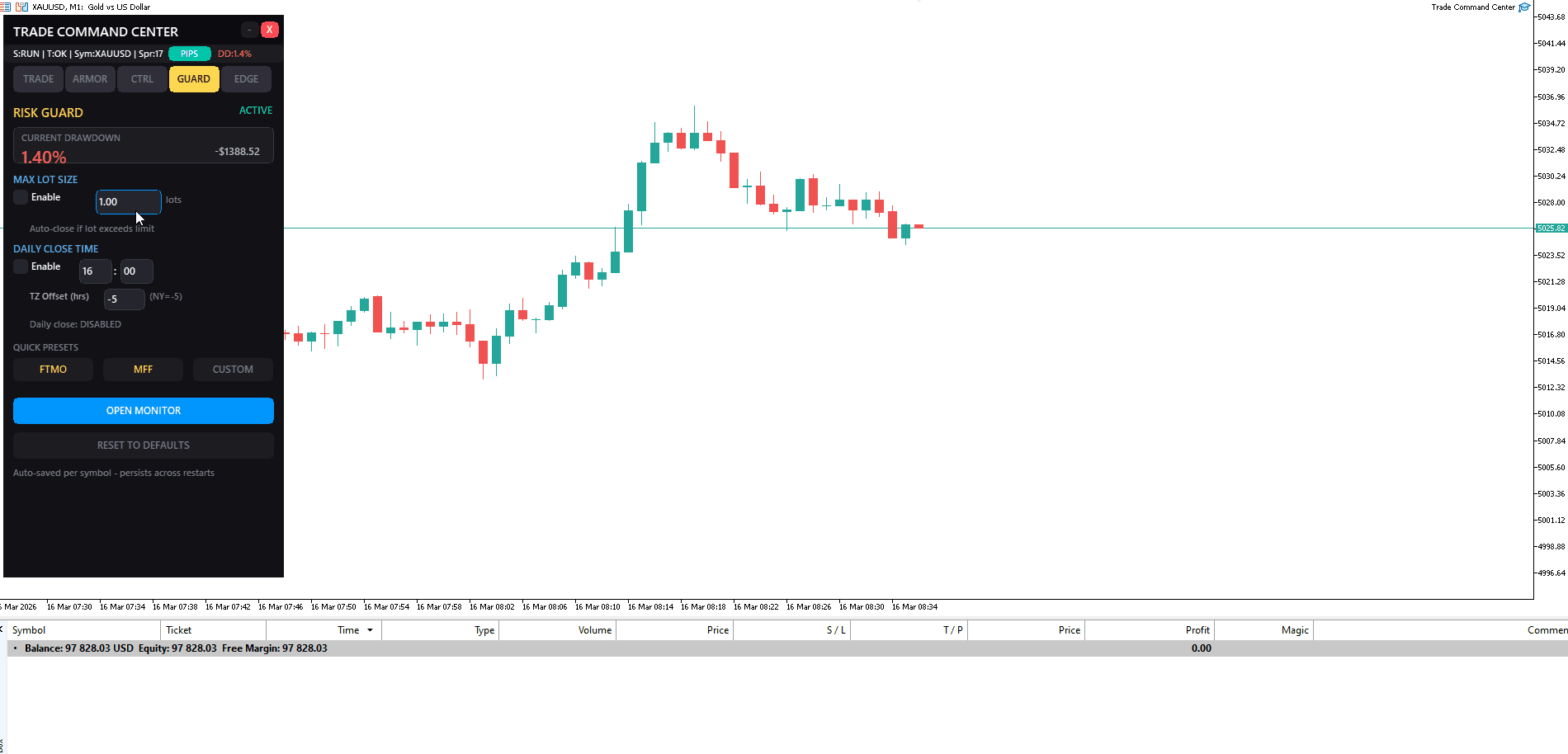 GUARD — Limiti rischio, display drawdown, preset prop firm