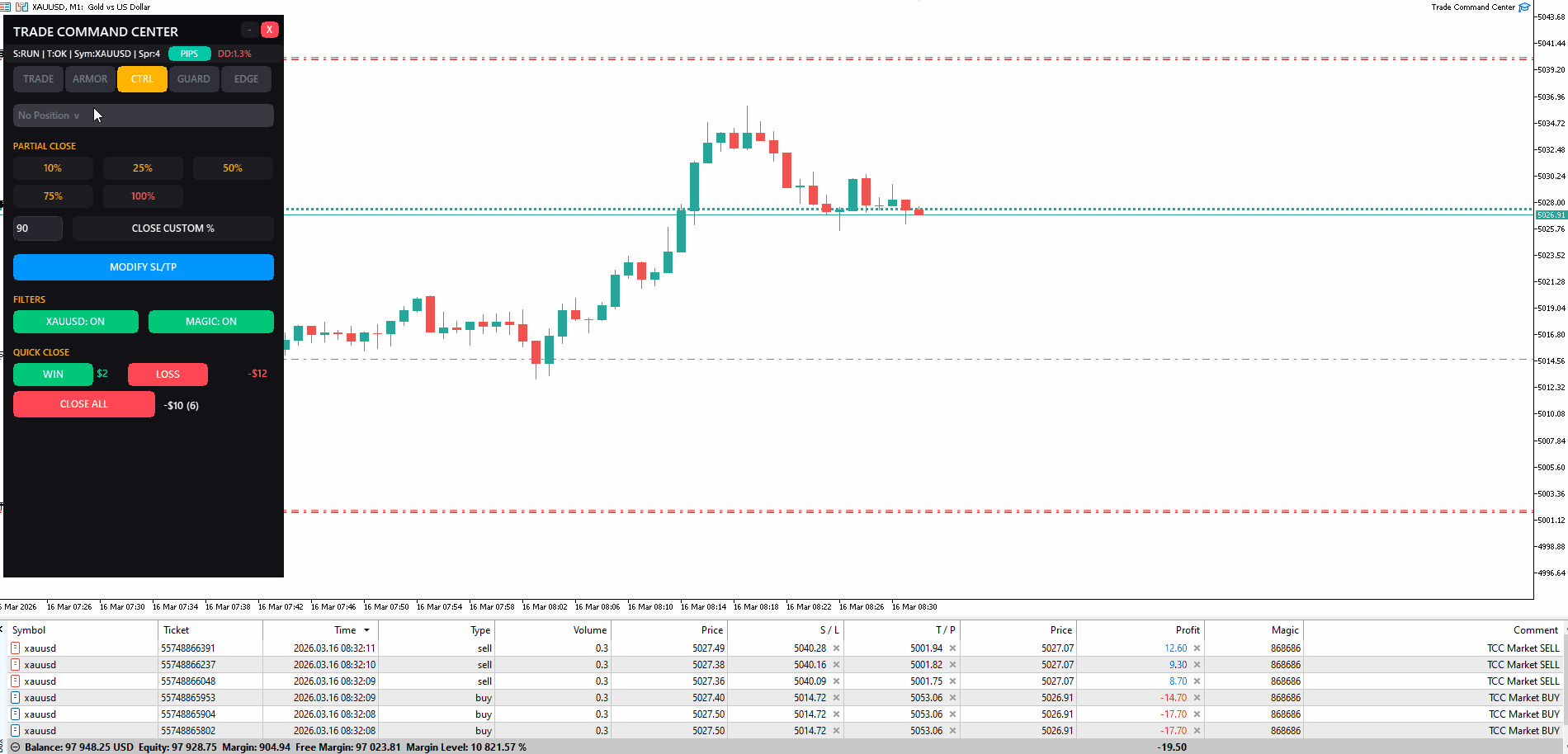 - Controllo Posizioni: Chiusura parziale a percentuali preimpostate. Chiusura rapida per stato profitto. Filtri simbolo e magic.