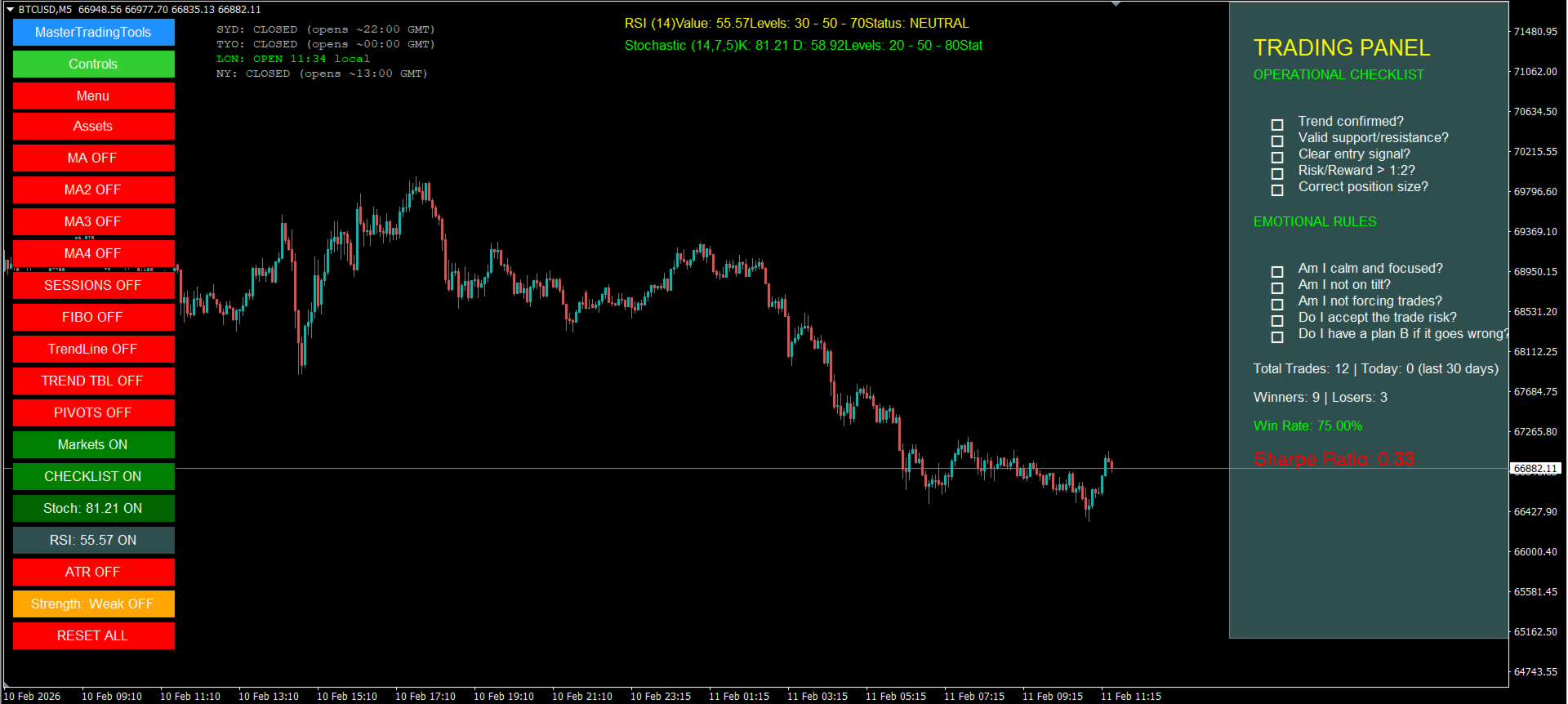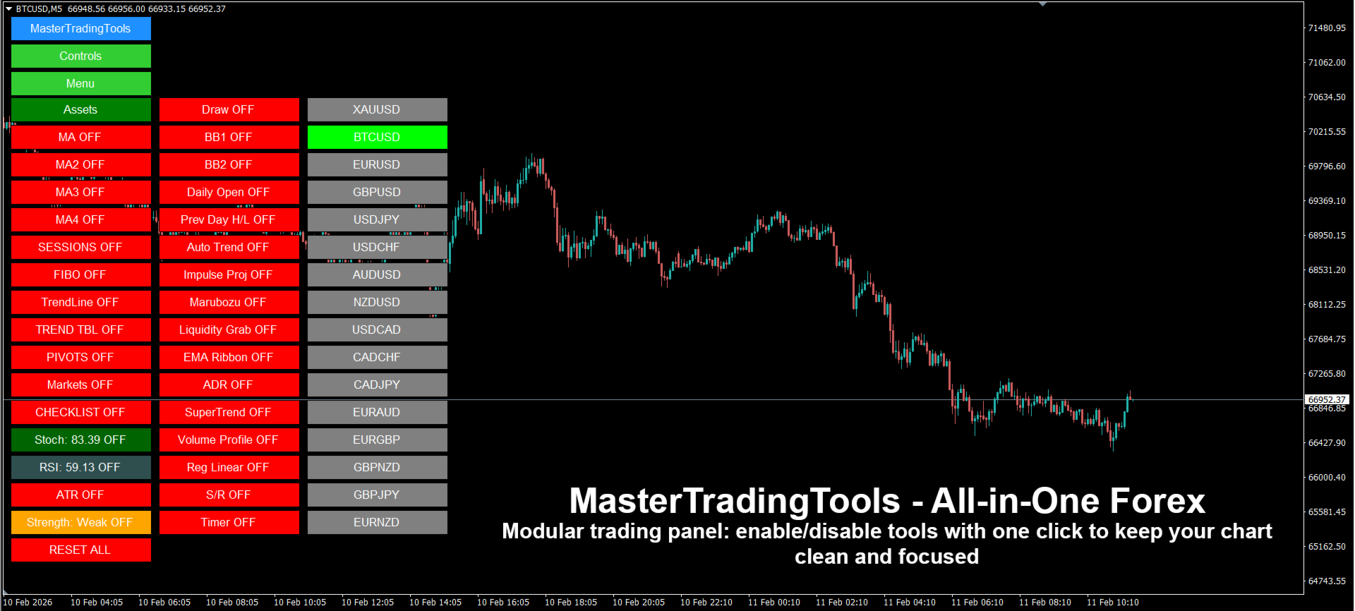 MasterTradingTools is a modular “all-in-one” panel for MetaTrader 4, built for beginner and intermediate Forex traders who want to turn their chart into a clearer, more organized, and more disciplined process.