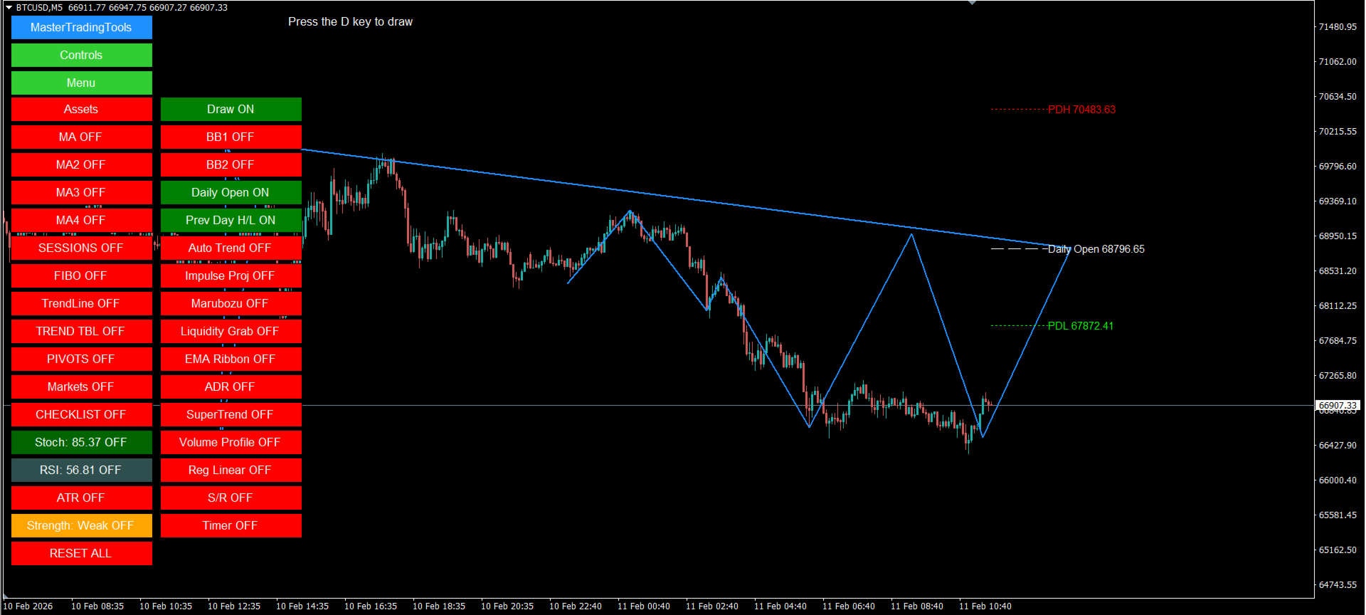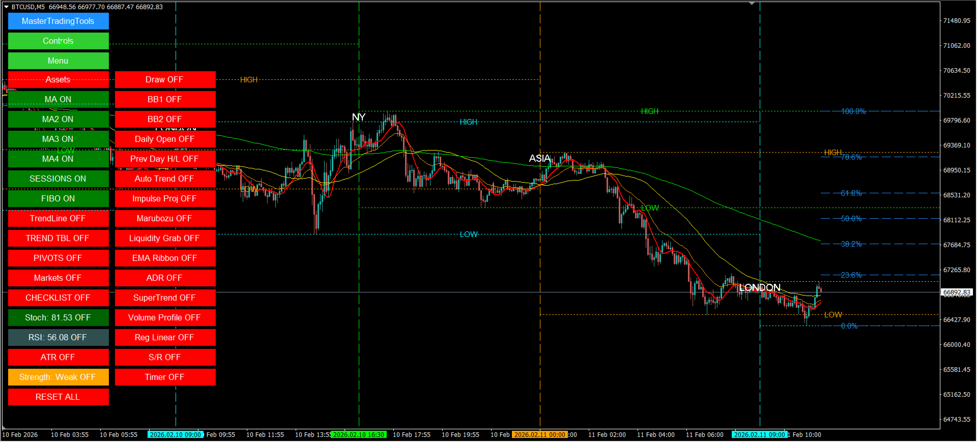 Instead of using multiple separate indicators (and cluttering the chart), you enable only what you need with ON/OFF buttons, keeping your focus on context + key levels + execution.
