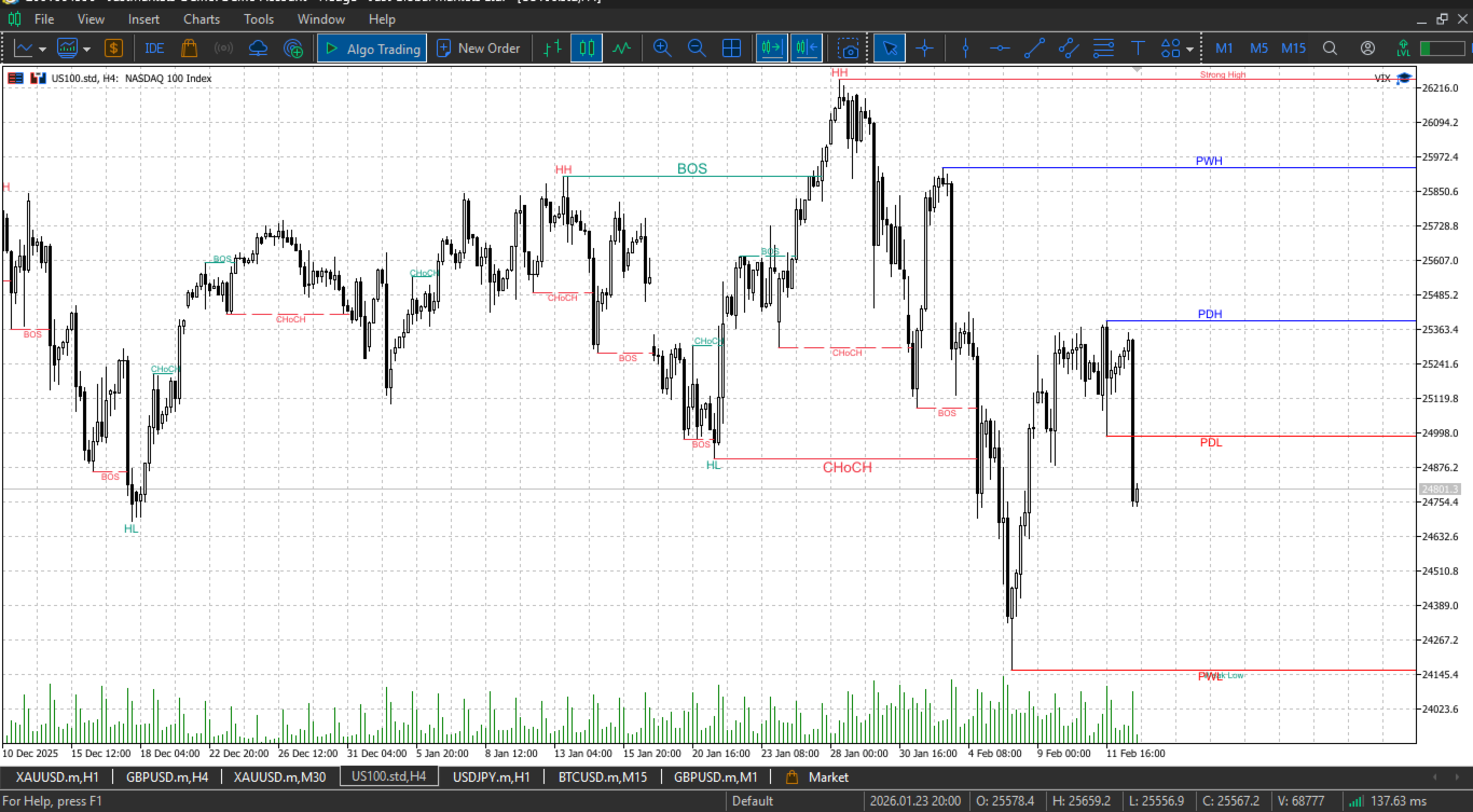 All structure breaks are calculated based on confirmed price action. Once a break is printed, it does not disappear or repaint.