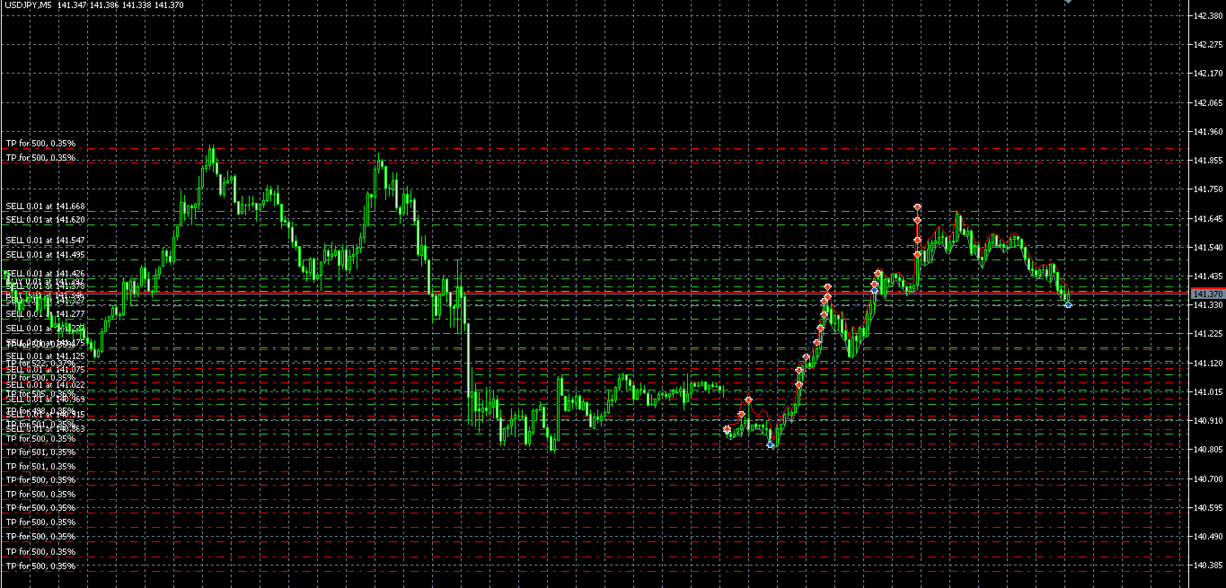 The system continuously monitors the market price and automatically places new orders when the price moves by the set GridSize. Each order is equipped with a take-profit, so profits are realized automatically. After closing all positions in one direction, the grid is automatically reset and ready for new market movements.