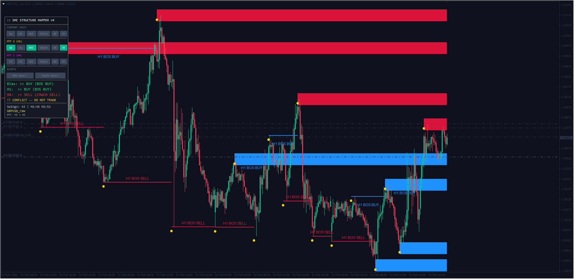 Unlike most SMC indicators that only work on a single timeframe, SMC Structure Mapper gives you simultaneous analysis across 3 timeframes — your current chart plus two higher timeframes of your choice. The built-in confluence engine compares bias across all timeframes and tells you when they align (strong setup) or conflict (stay out).