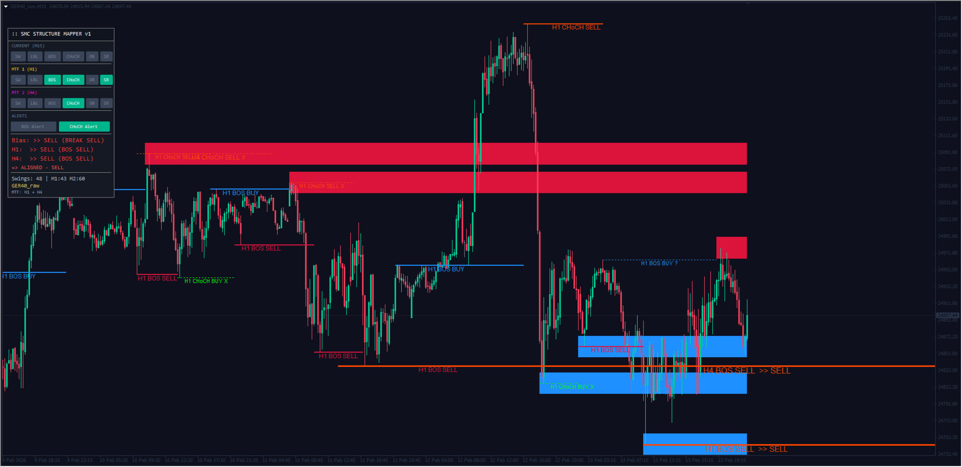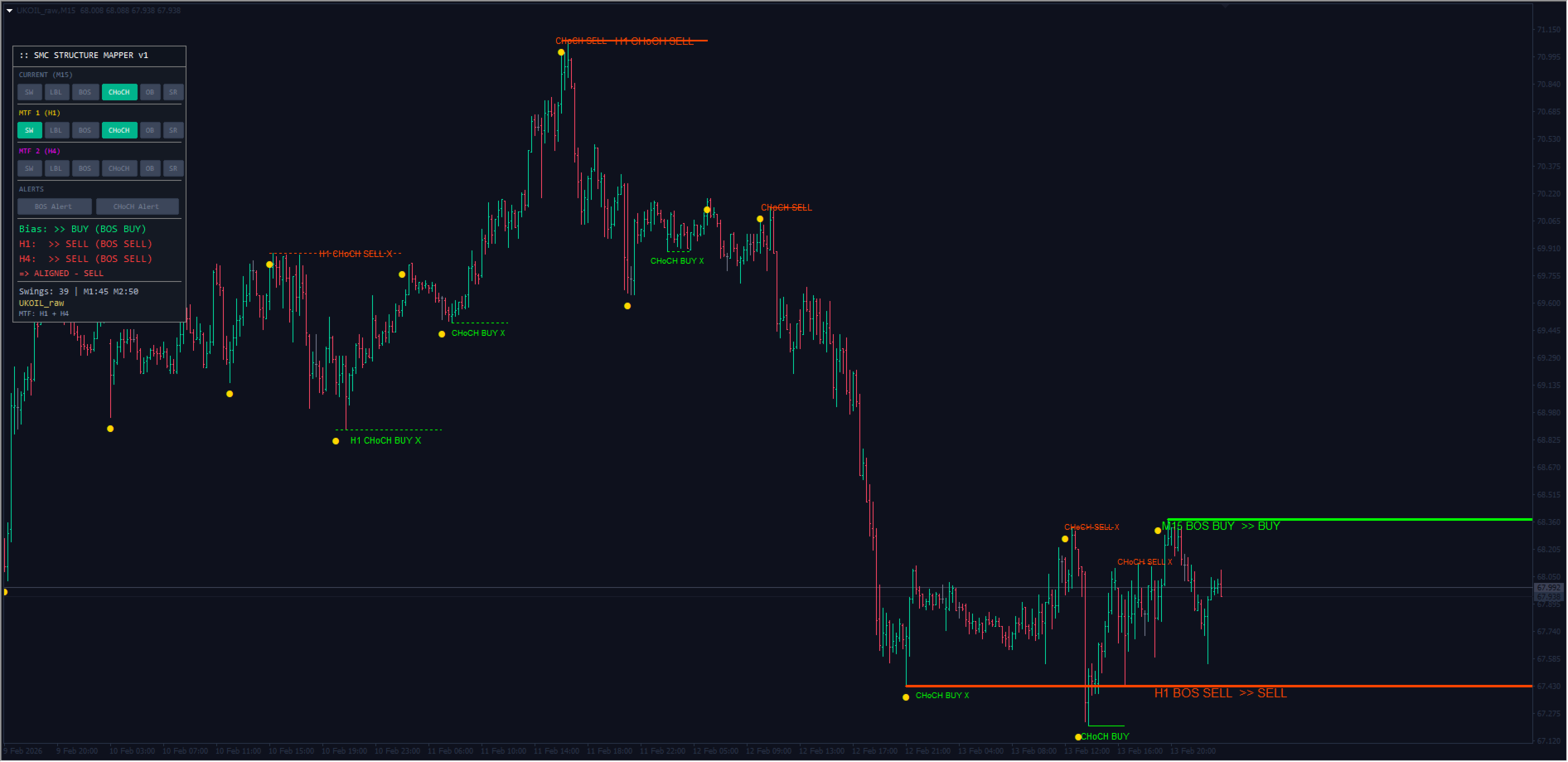 Recommended workflow: Look for CHoCH on your entry timeframe, confirm with higher timeframe BOS/CHoCH alignment shown in the panel, and use Order Blocks as entry zones.