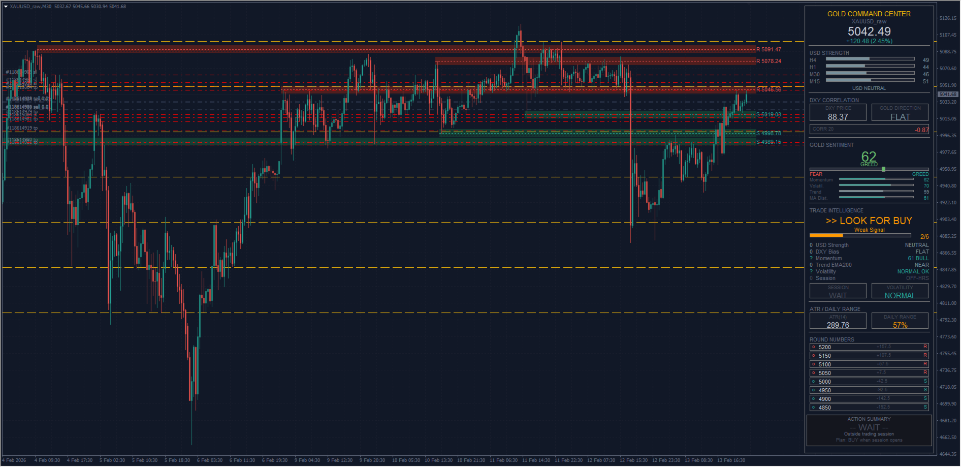 Gold Command Center is a complete analysis dashboard for XAUUSD traders. It combines six analytical modules into a single compact panel that helps you decide what direction to trade, when to enter, and which levels to watch.
