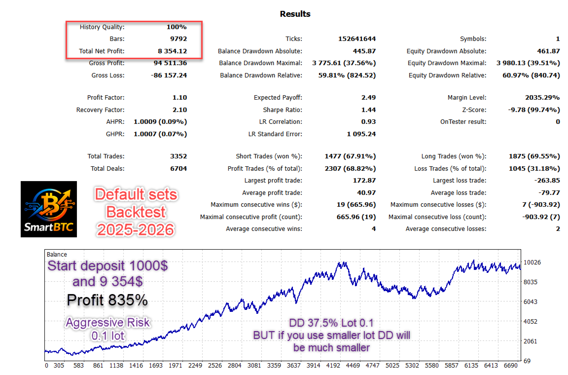 SmartBTC is a hybrid EA designed for BTCUSD (crypto CFD) trading in MT5. It combines a signal-based entry approach with a trend/flat filter and an active trade management layer. The goal is simple: structured entries, fast profit protection, and configurable recovery logic for high-volatility markets.