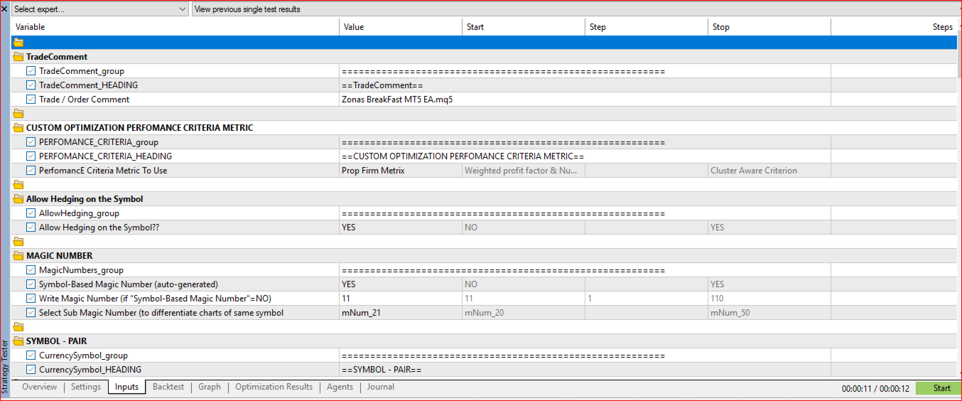 - Default testing and optimization done using 'open price only' modelling mode with virtual-stop enabled