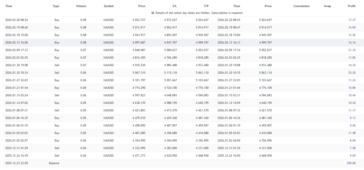 One symbol, one timeframe, and only one trade at a time — always with a predefined Stop Loss and Take Profit. No grids. No martingale. No risk tricks.