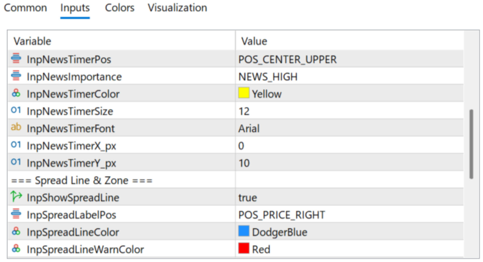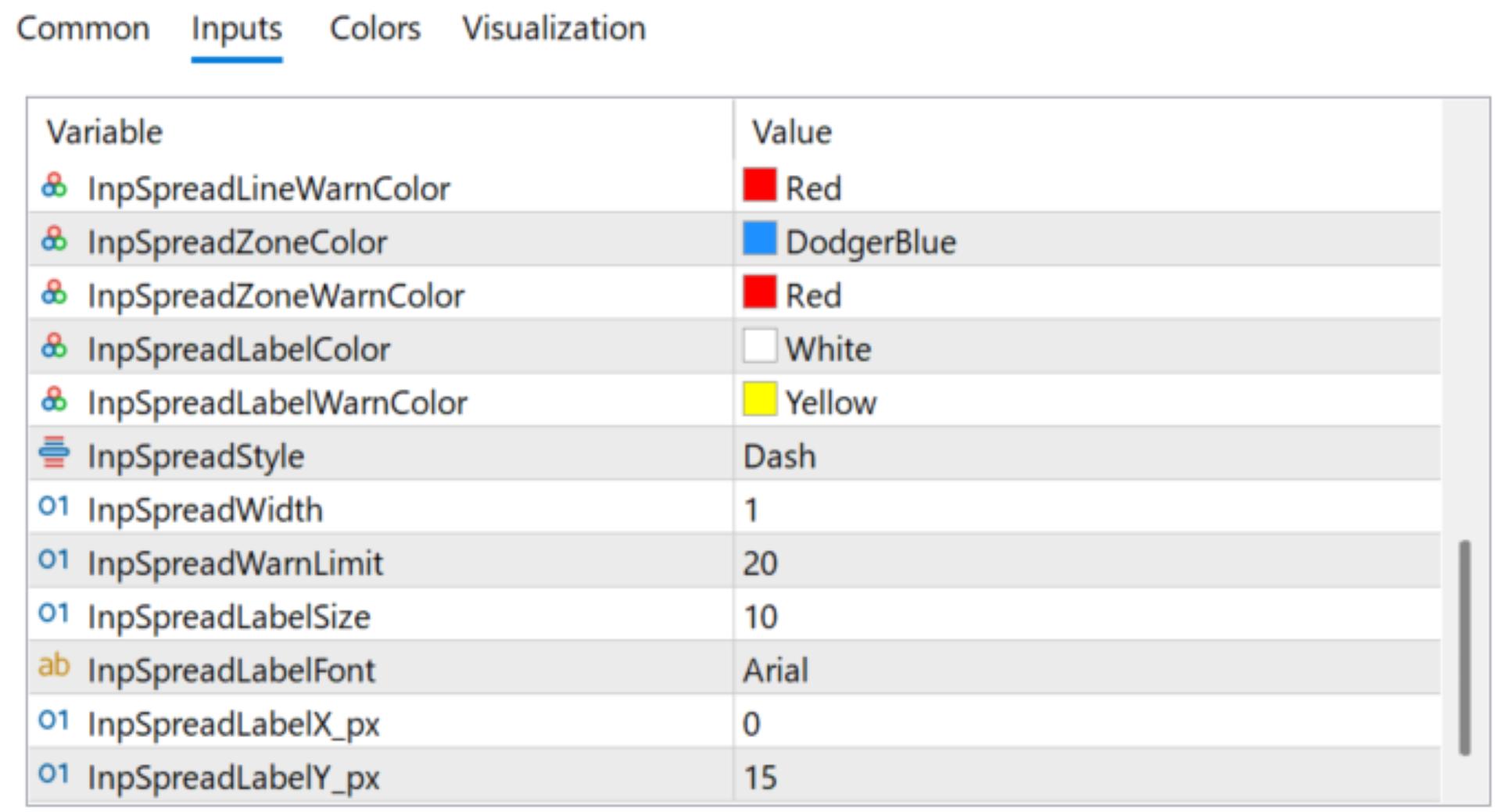 InpSpreadLineColor / InpSpreadZoneColor: Color configuration.